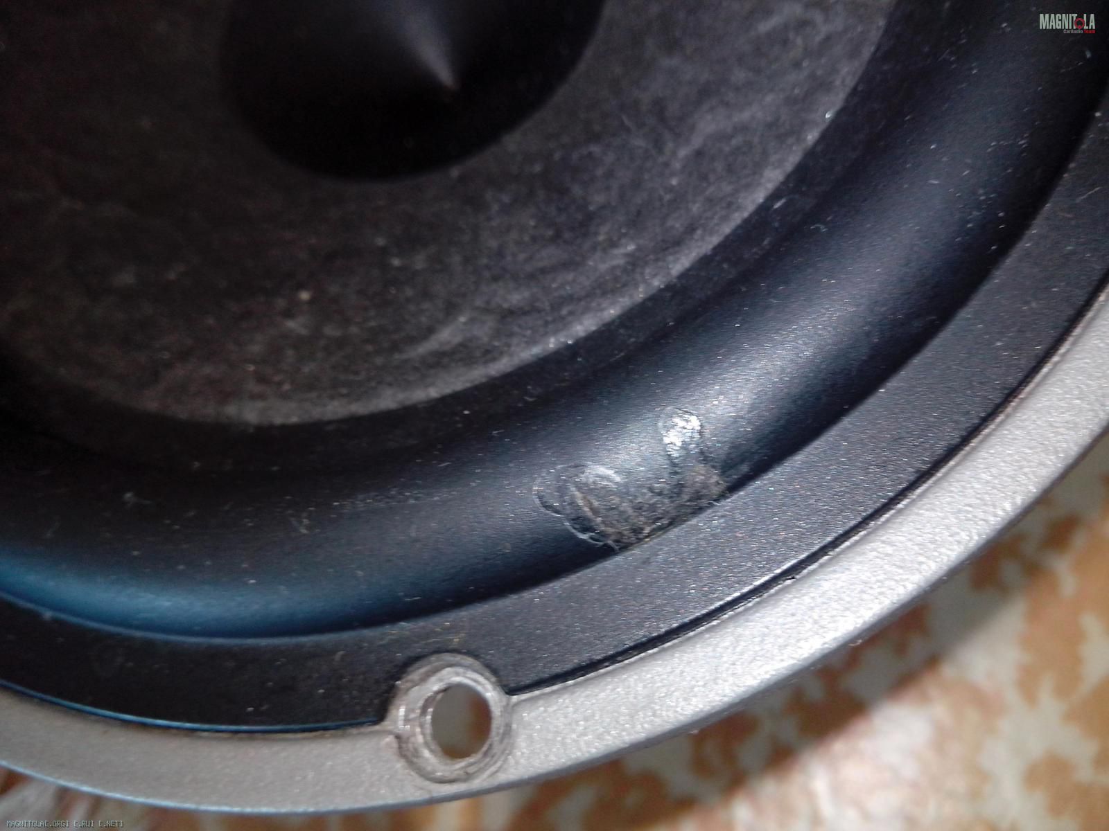 Отсутствуют серебристые вставки в грили, на одном миде проткнут отверткой и заклеен подвес, на твитере трещина корпуса на звук не влияет.