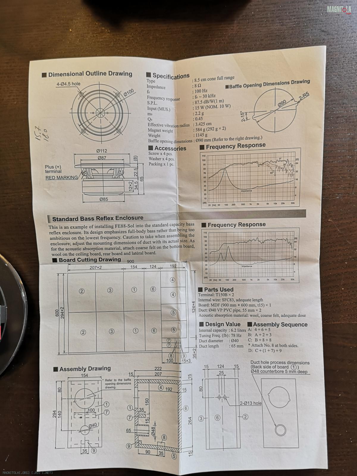 Резонансная частота fS 105.5 Hz Электрическая добротность QES 0.51 Механическая добротность QMS 3.91 Полная добротность QTS 0.45 Эквивалентный объём VAS 2 litres Сопротивление DC RE 7 Ω Индуктивность звуковой катушки LE 0.06 mH Форс фактор BL 4.47 T/m