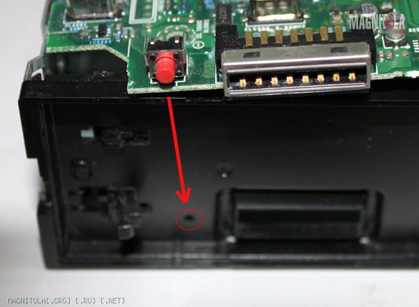 Кнопка сброса находится обычно под съемной панелью около коннектора соединяющей панель с основной тушкой магнитолы.