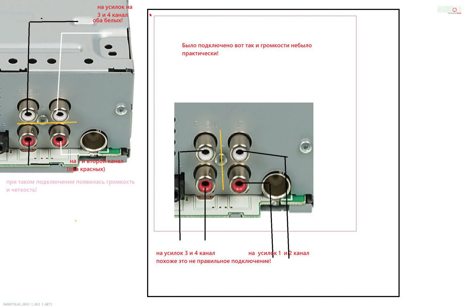 фото из тырнета, на магнитоле у меня ничего не подписано даже. Может на моей магнитоле подразумевается что Белые разъемы (какой из них правый и левый канал можно выяснить методом тыка) идут на 1 и 2 канал усилка. А красные разъемы магнитолы идут на оставшиеся 3 и 4 каналы усилка. Ну раз заработало - получается так и задумано. А может и нет. Возможно теперь звук идет с левой и правой колонки только левого канала.. Это нужно трек стере-теста поставить и проверить.