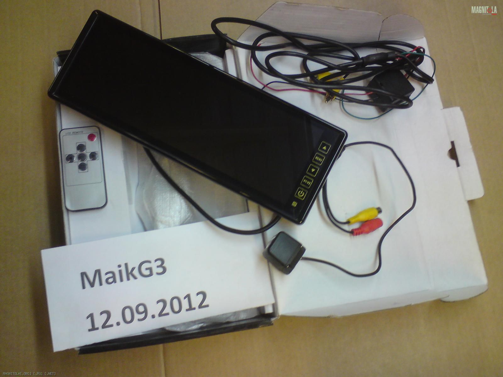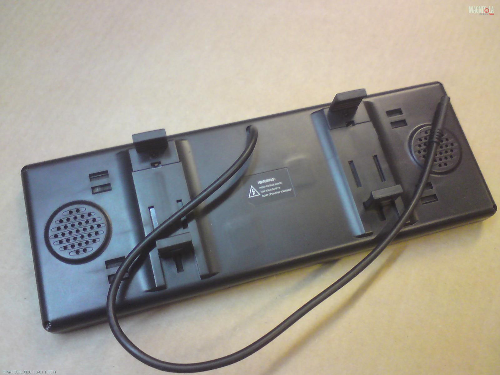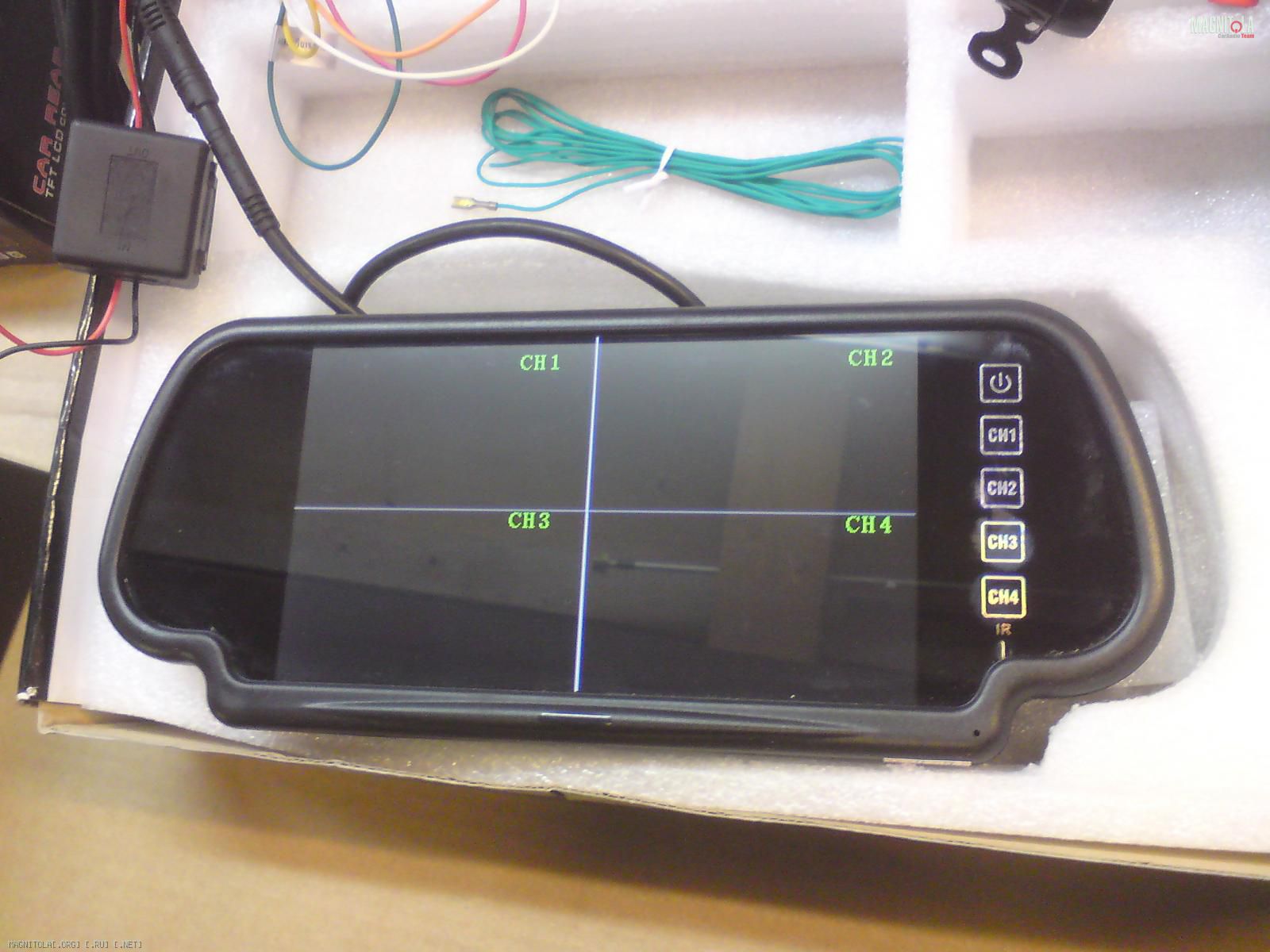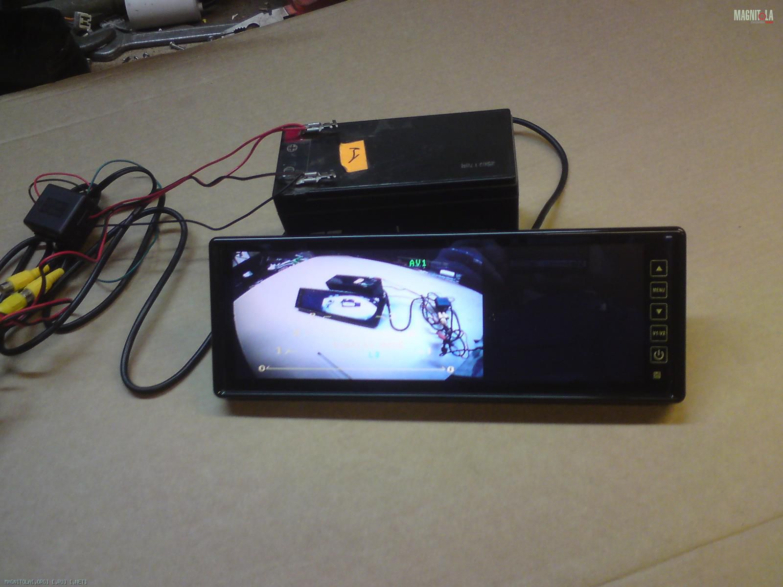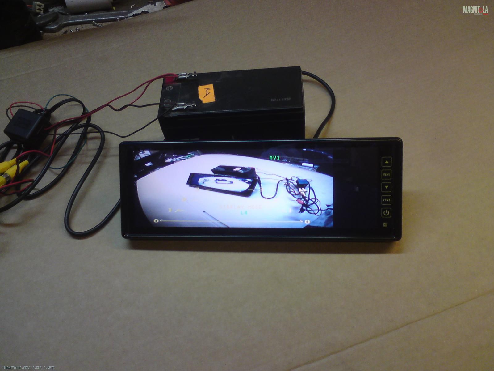Монитор 10" в габаритах зеркала- изображение сжато по вертикали, фильмы не посмотришь ((( но для функции "сдаем задом" это не принципиально. два видеовхода. В комплекте цветная камера (утрачен крепежный кронштейн).