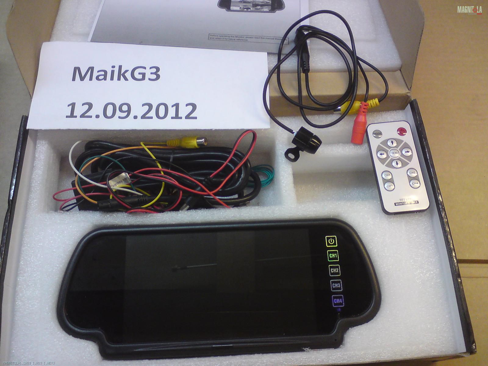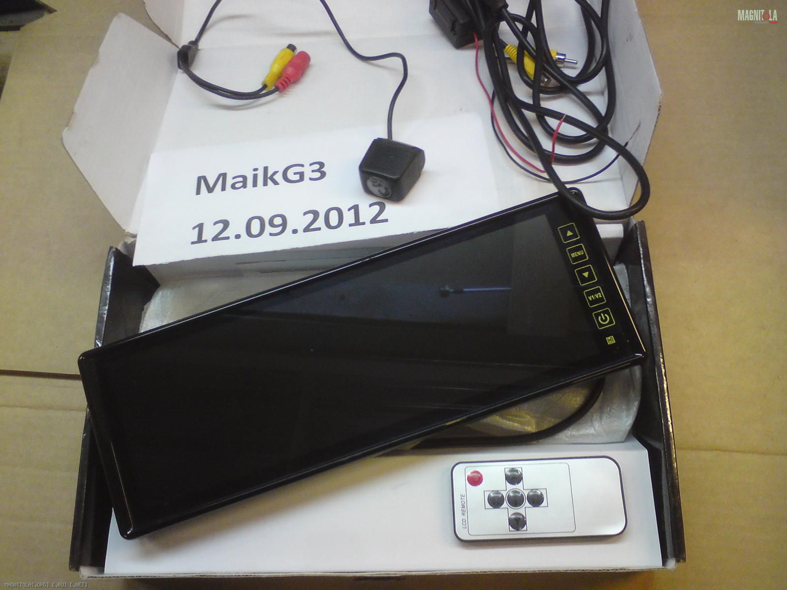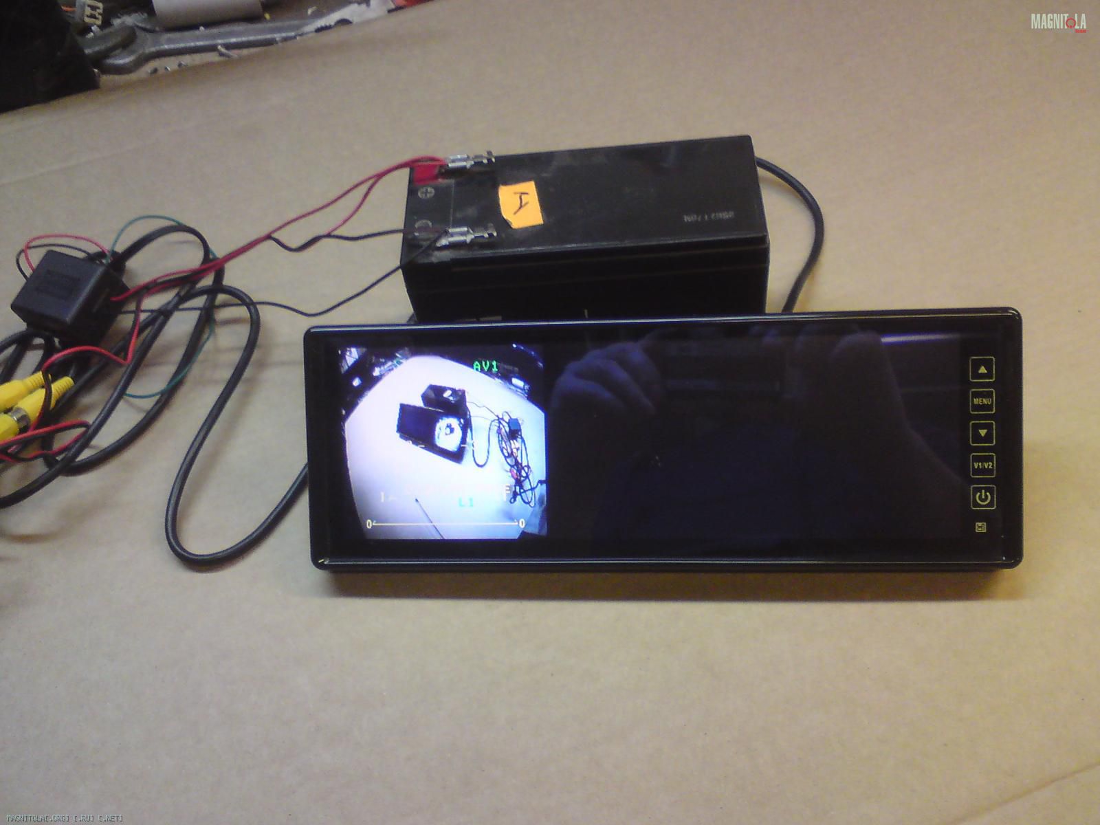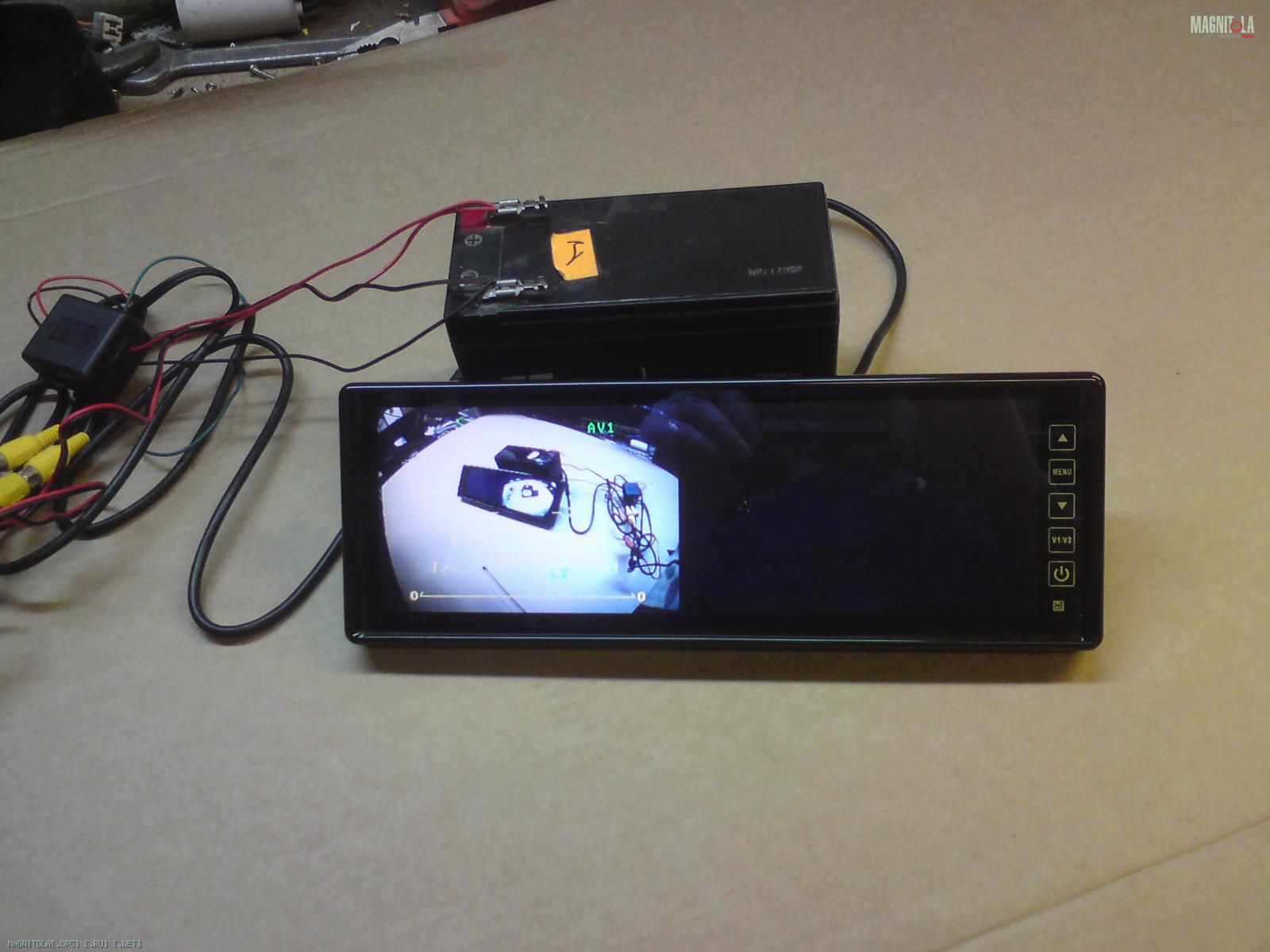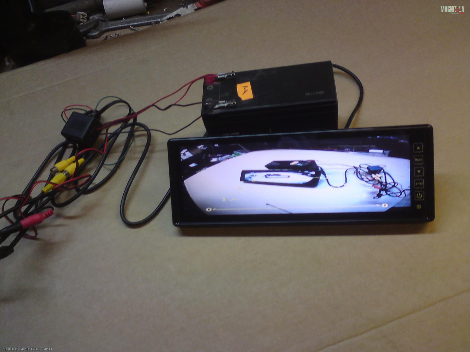 Монитор 10" в габаритах зеркала- изображение сжато по вертикали, фильмы не посмотришь ((( но для функции "сдаем задом" это не принципиально. два видеовхода. В комплекте цветная камера (утрачен крепежный кронштейн).