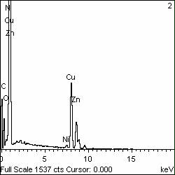 С внутренним составом было сложнее, т.к. срез получился в "тени" от спектрометра, что могло внести искажения: 64,33% Cu, 32,22% Zn, 1,19% Ni и 2.27 кислород.
