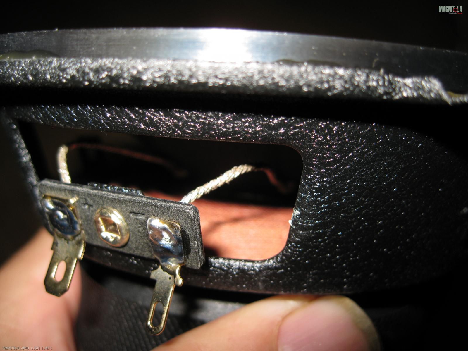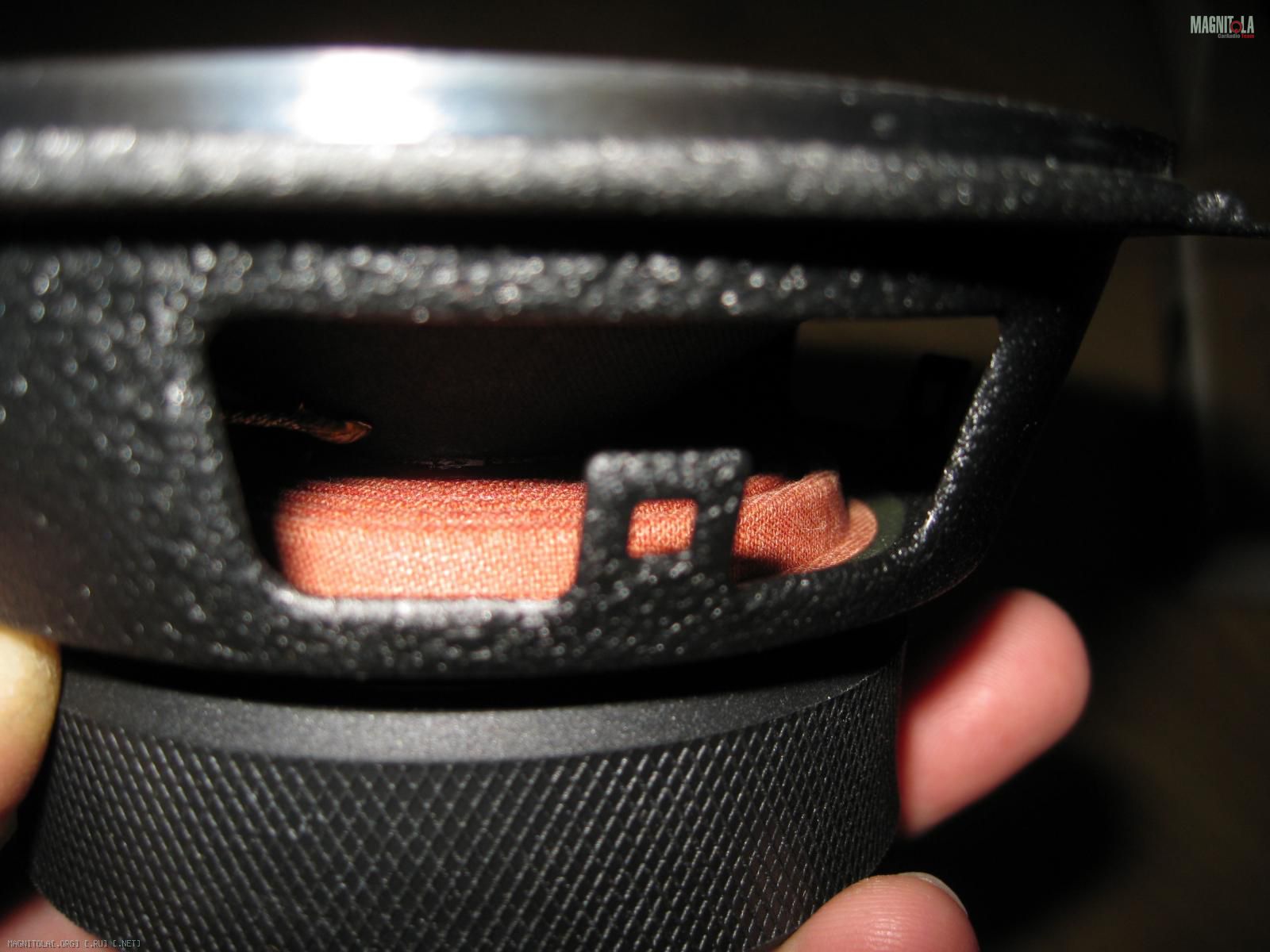 Штампованная стальная корзина, покрытая защитной краской в стиле шагрень, которая так же выполняет и роль, как и у многих иных брендов, гасителя призвуков корзины. Исполнение очень добротное и качественное. Магнит так же закрыт защитным резиновым чехлом. Центральное вентиляционное отверстие так же прикрыто защитной сеткой. Тот же бумажный диффузор с примесями кевларового волокна и защитным покрытием диффузора снаружи с виду и на ощупь напоминающим мелкой структуры шагрень. Тот же тканевый с покрытием и брендовой надписью защитный колпачок. Тот же способ исполнения клеммника и подводящих проводом. В общем полная реинкарнация былого девайса, который в своё время был популярным компонентом в инсталах основанных на качественных бюджетных компонентах.