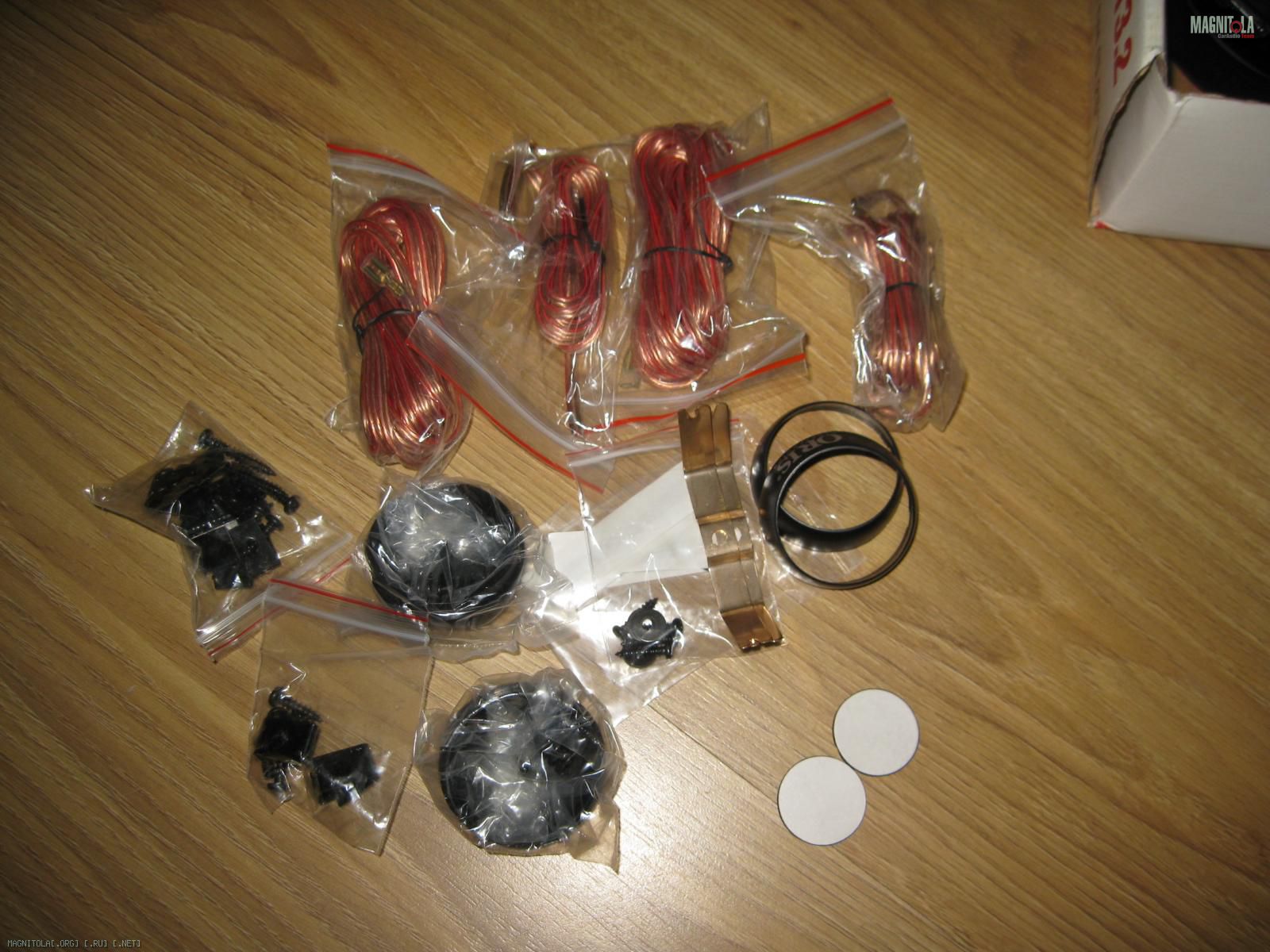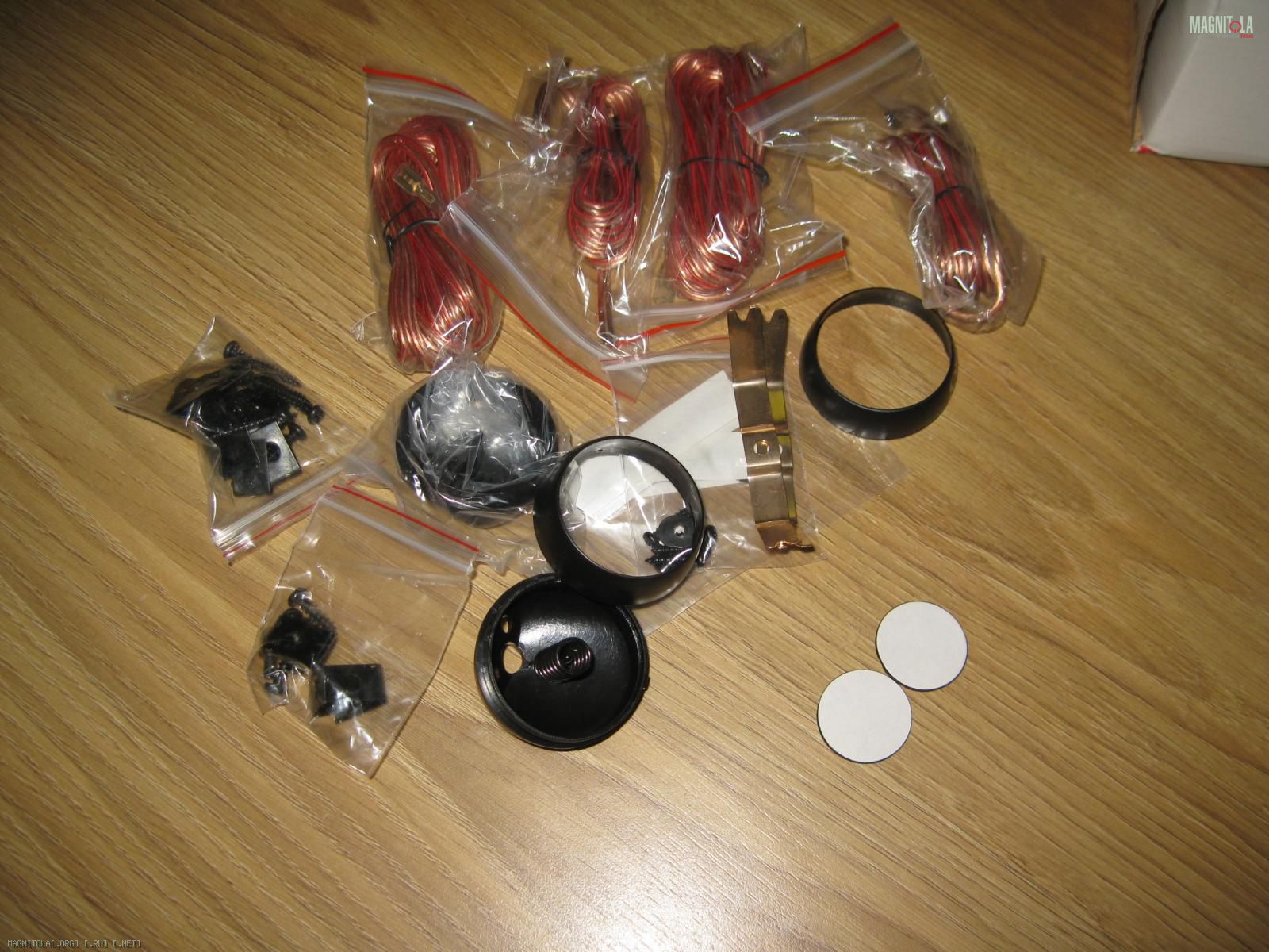 Как видно на фото это набор крепежа как для мидов так и для твитеров и в том числе угловые чашечки для установки твитеров на поверхность под углом, ну и набор проводов.