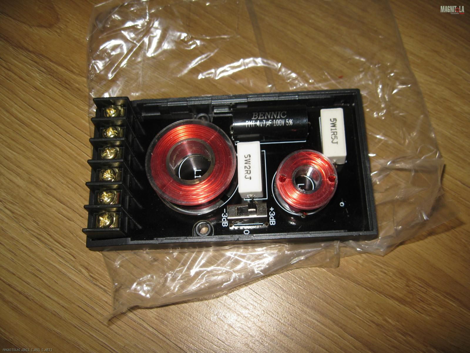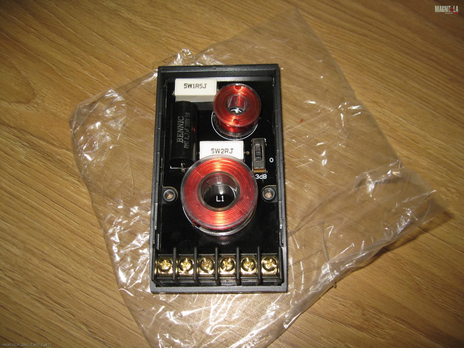 Как видим комплектующие конечно же не уровня топ-хай-энд ))), но абсолютно хорошего уровня. Катушки воздушные, конденсатор плёночный и кстати совсем не последнего бренда производителя, трёх позиционное переключение уровня твитеров, т.е. всё на хорошем уровне. Структура кроссовера I+II, т.е. мидвувер достался первый порядок фильтра, твитеру второй.