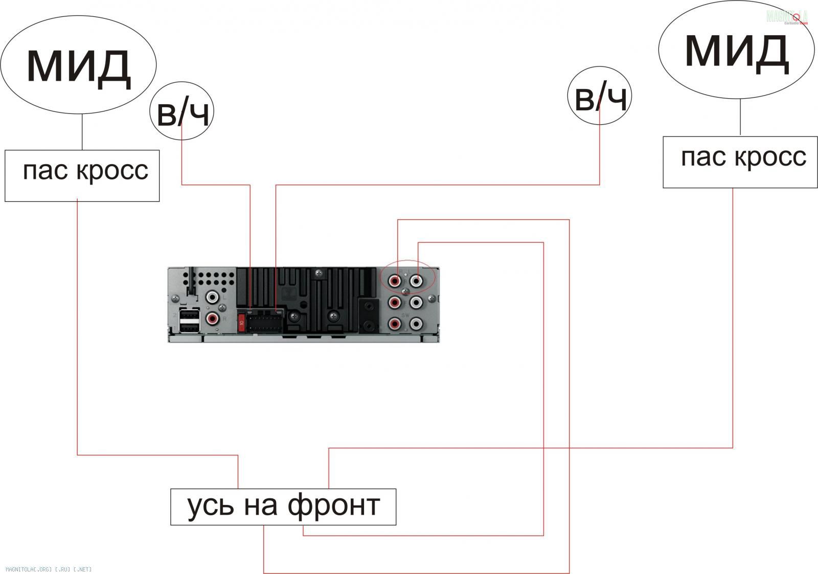 Схема такая: Усилитель подключен через выход RCA на тыл, пищи через ввыход разъема ISO на фронт