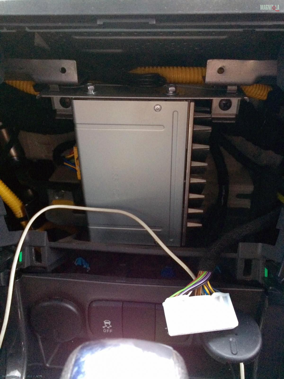 А вот нынешний усилитель, который стоит за блоком управления климатом, ниже штатной магнитолы. Приятно удивлен, что все толстые провода в гофре желтого цвета, а остальные мелкие в оплетке.