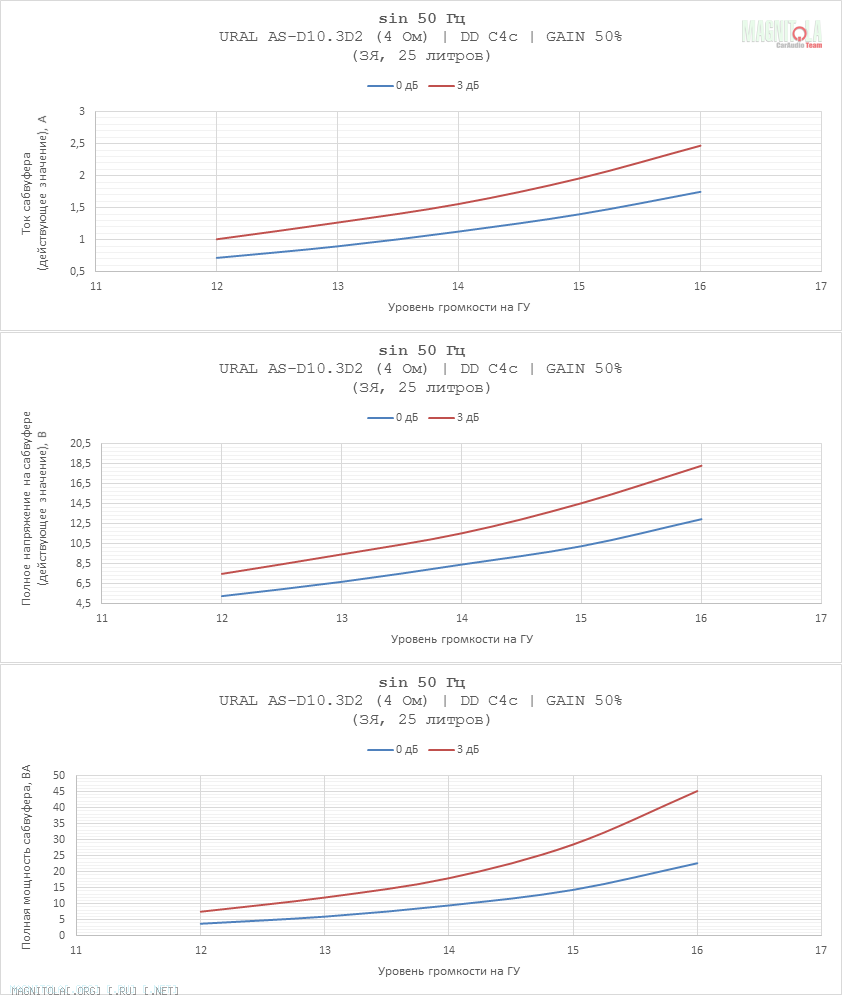 Суть в чем - mp3 файл sin 50 Гц, 70 Гц и 100 Гц на флэшку, фронт отрезан на ГУ, только саб, в общем. Замерял ток в цепи саба, напряжение полное на клеммах саба, напряжение на клеммах выхода усилителя (на очень малой мощности хорошо заметен фазовый сдвиг в цепи саба) и ток от источника при 14.2 В.