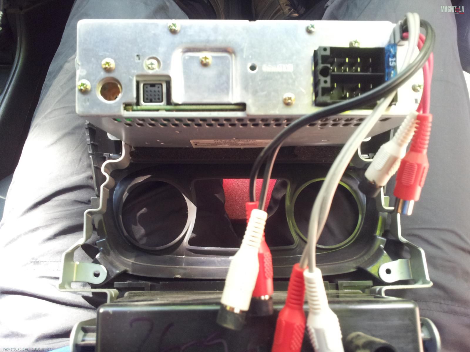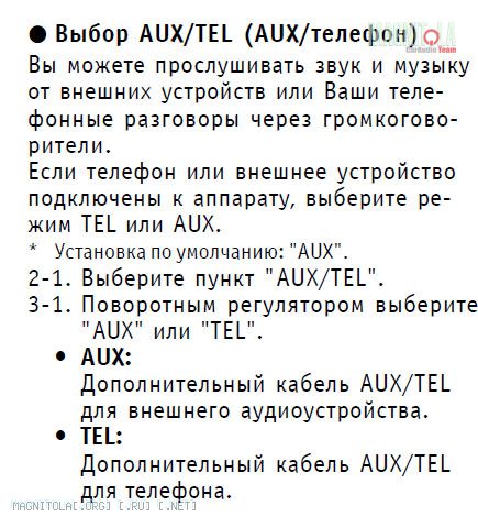 Ну,если на "морде" магнитолы нету гнезда AUX,то Вам полюбому её надо вытаскивать,искать его сзади. А сзади он может быть реализован или через "тюьпаны"-rca штеккерА,джек 3,5-"как на наушниках" или свой,клариковский.Стало интересно,попробовал найти в нете,кроме как "двухканальный вход"-ничего не увидел,скорее имели ввиду fca,тогда Вам будет нужен шнурок 2rca-3,5jack,есть там ещё и гнездо "телефонный вход",тоже непонятно в каком исполнении.