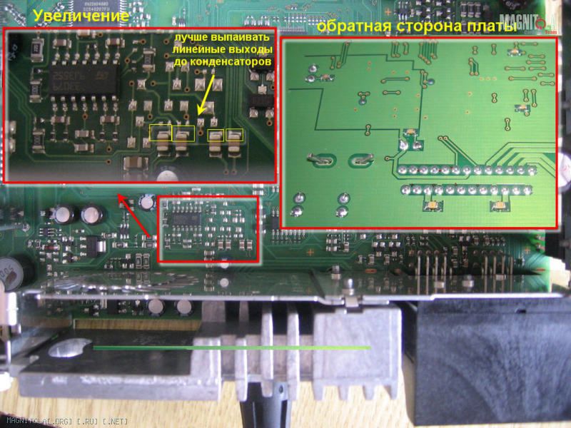 1 - выпаяны линейные выходы, нашел информацию на форуме авес-пежо. Сделано как на этом фото. Припаял тюльпаны также и для линейного входа.
