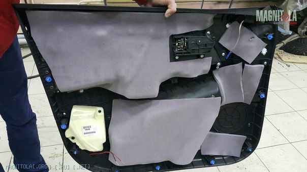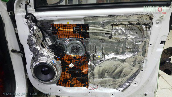 2. Ездил в другом городе к установщикам автозвука, снимали обшивку двери, посмотреть как все сделано. Говорят, что шумоизоляция по сути то и не сделана, а есть только виброизоляция. Фото приложил.