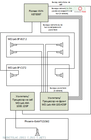 3. Установщик меня убедил, что нужен отдельный усилитель со звуковым процессором на пищалки и фронт, а тыл можно подключить от магнитолы. При этом комплектные кроссоверы компонентной акустики он не использовал, а настроил срезы в процессоре. Зачем так, он не смог дать объективного ответа, а что-то вроде уже пару лет так делаю :D