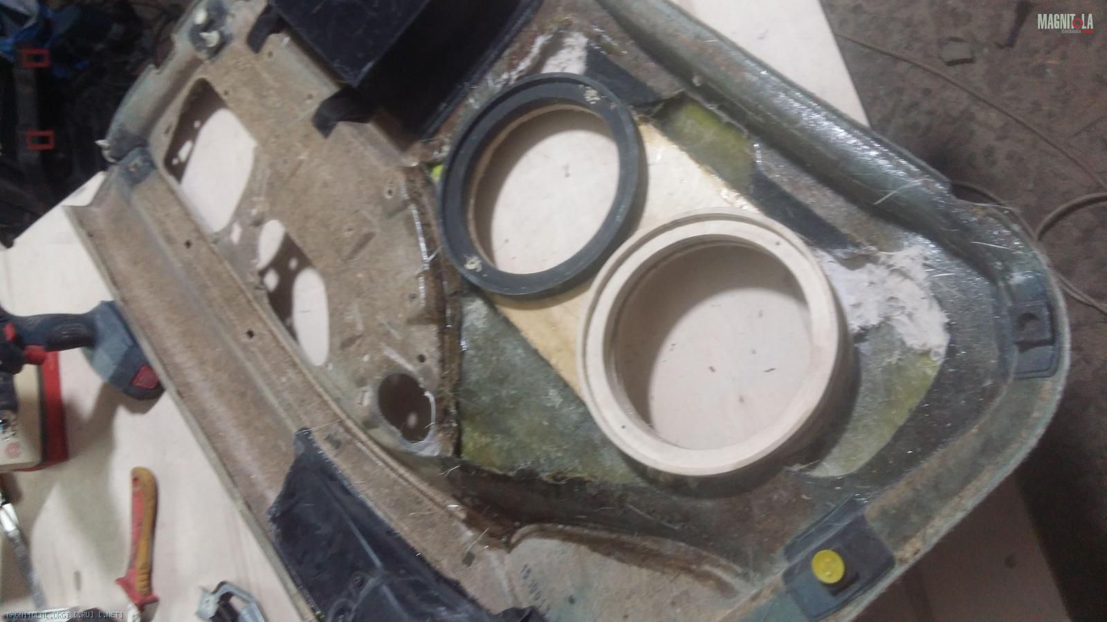 Взял основу из 21 фанеры на половину тех.отверстия в двери. А остальное заделал стекловолокном. И покрасил. Выставил проставочные кольца. Всю конструкцию прикрутил к металлу двери с помощью болтов м6 и резьбовых заклепок. Параллельно занимался обшивками дверей. Ещё надо вышкурить обшивки и обтянуть автокожей.