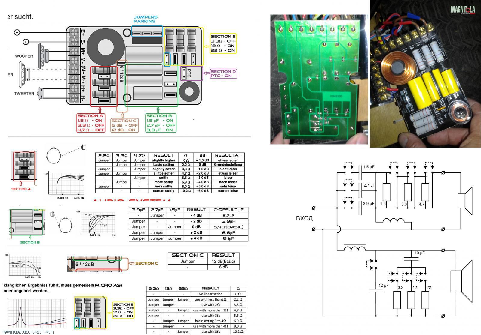 5. Эти кондёры и катушки, как-то соединённые и присоединённые, называются словом "кроссовер". Есть много схем кроссоверов, есть много параметров элементов кроссоверов, есть миллионы комбинаций этих схем и параметров, есть специальность инженера электронщика чтобы в них разбираться.