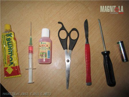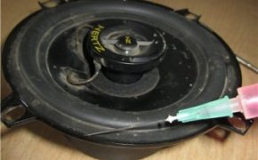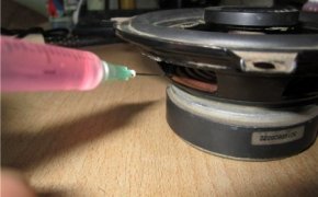 Если динамики начинают хрипеть, то не стоит паниковать и сразу покупать что-то новое, можно отремонтировать уже имеющиеся динамики. Для работы пригодятся следующие инструменты и материалы: отвертка, ацетон, двусторонний скотч, фотопленка, нож, батарейка на 3 вольта, клей для резины, шприц, ножницы, отрезок ватмана. Сначала нужно аккуратно размочить верхнюю резинку и нижний диффузор от клея и чтобы сделать это нужно использовать шприц с ацетоном внутри.
