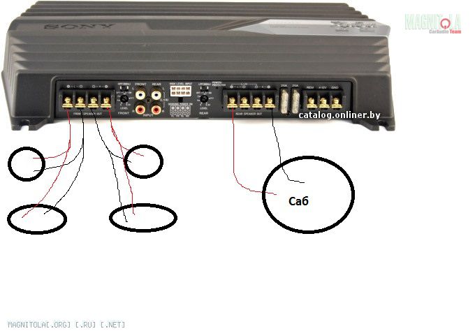 Подключенно все к одному усилителю,саб через мост на один канал, 4 колонки на остальной канал.