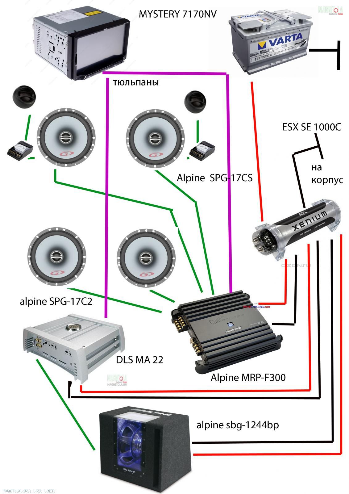 Магнитола мистери 7170nv. К ней аудиокабелем напрямую подключены 2 задних колонки Hertz dcx 165.3 и компонентная акустика hertz esk 165 с твиттерами. От магнитолы также идут 2 тюльпана на усилитель DLS MA22, к которому подключен сабвуфер Alpine 1244bp