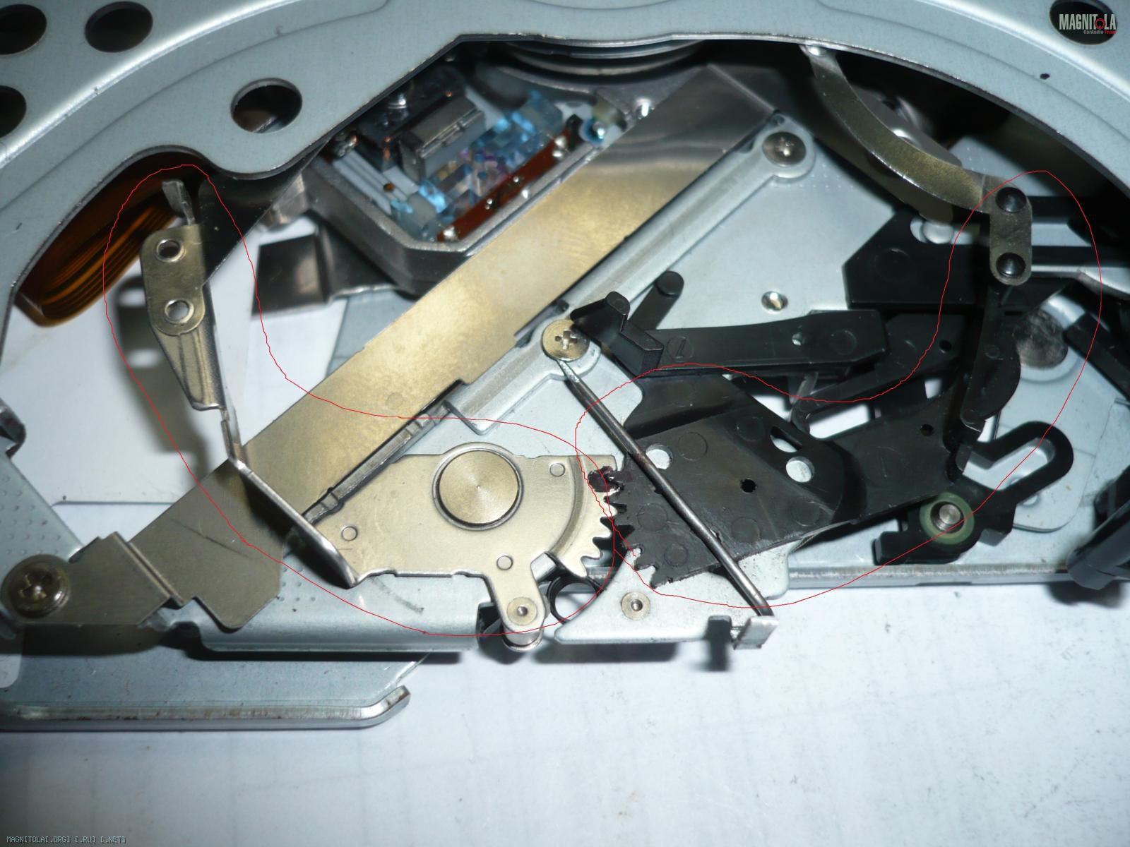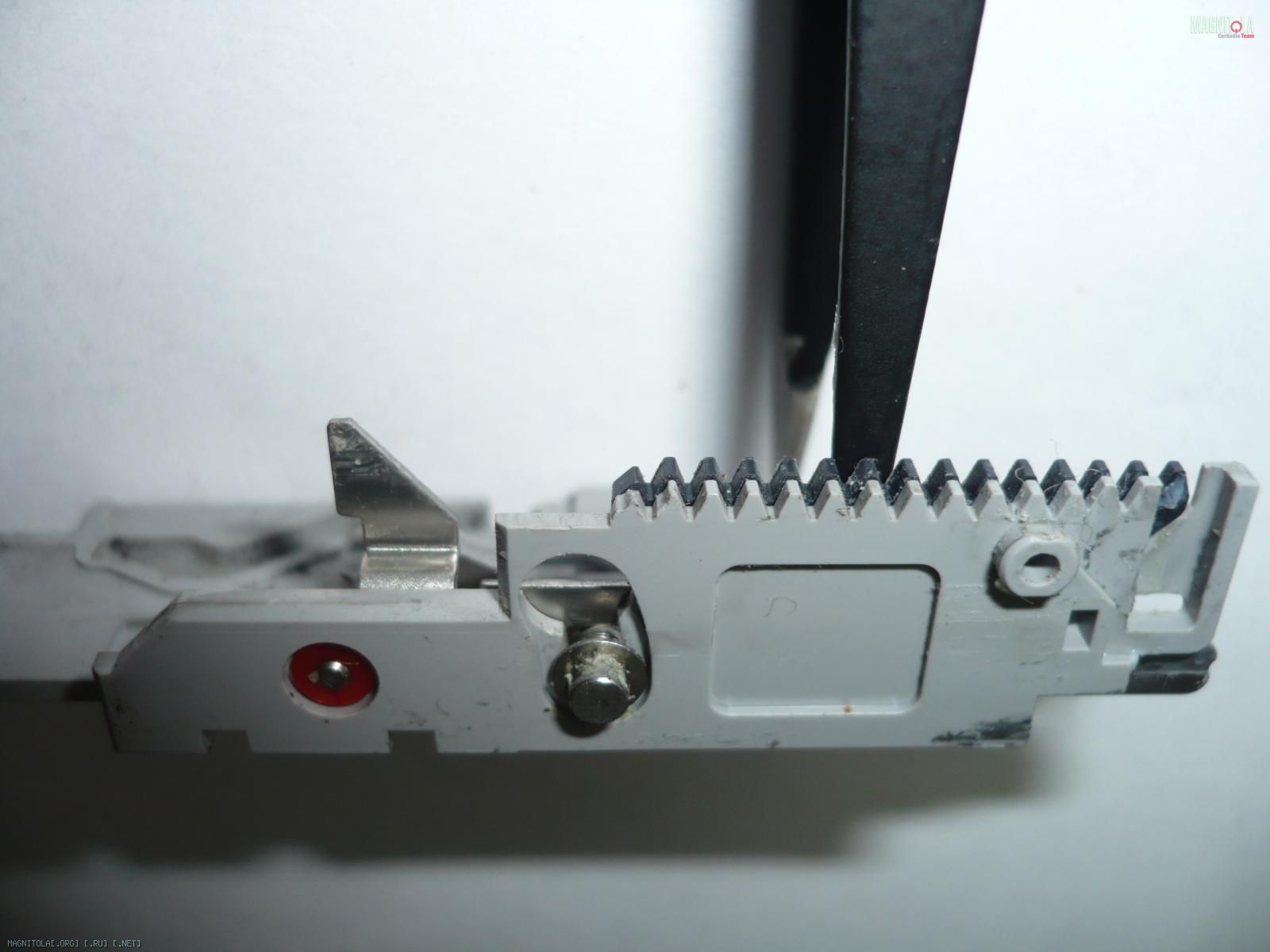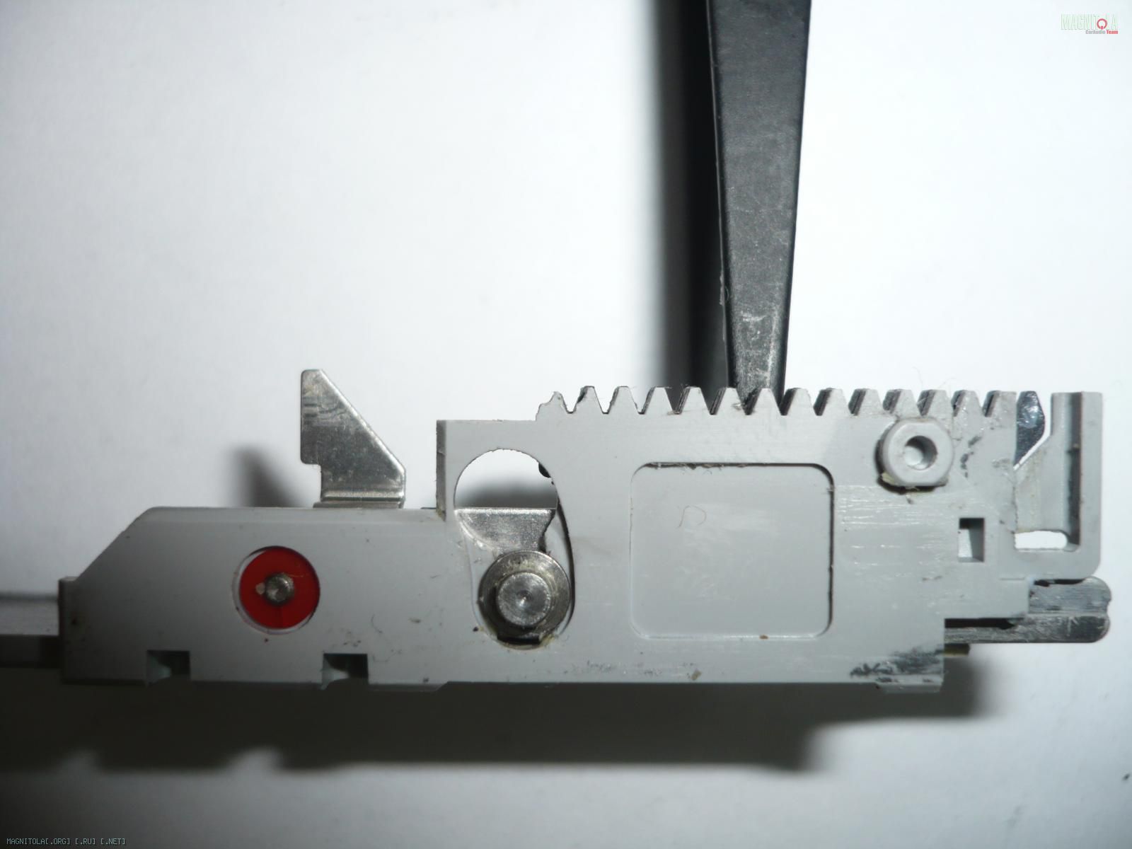 Делается все так: Расцепляем зубья соскочившие, задвигаем эту штуку на морде к центру и после этого сцепляем зубья в положение "как надо" (эти 2 вертикальные штуки в загрузочной щели датчики вставки диска и частично окончания загрузки (загрузка считается завершенной када эти штуки возвращаются в центр на свои места а диск своей кромкой дальней от морды отжимает пластинку пружинящую, вроде так если память не подводит)
