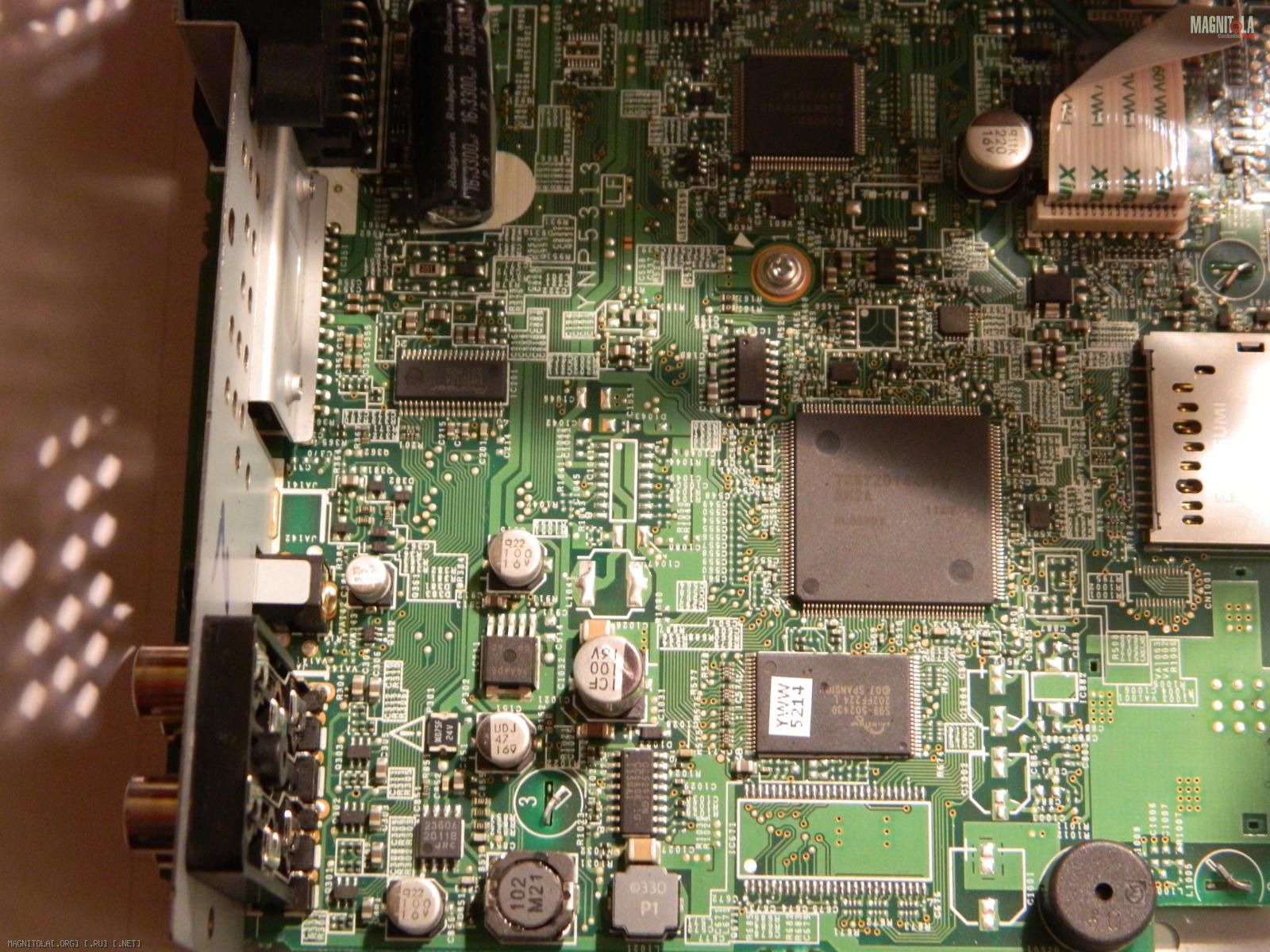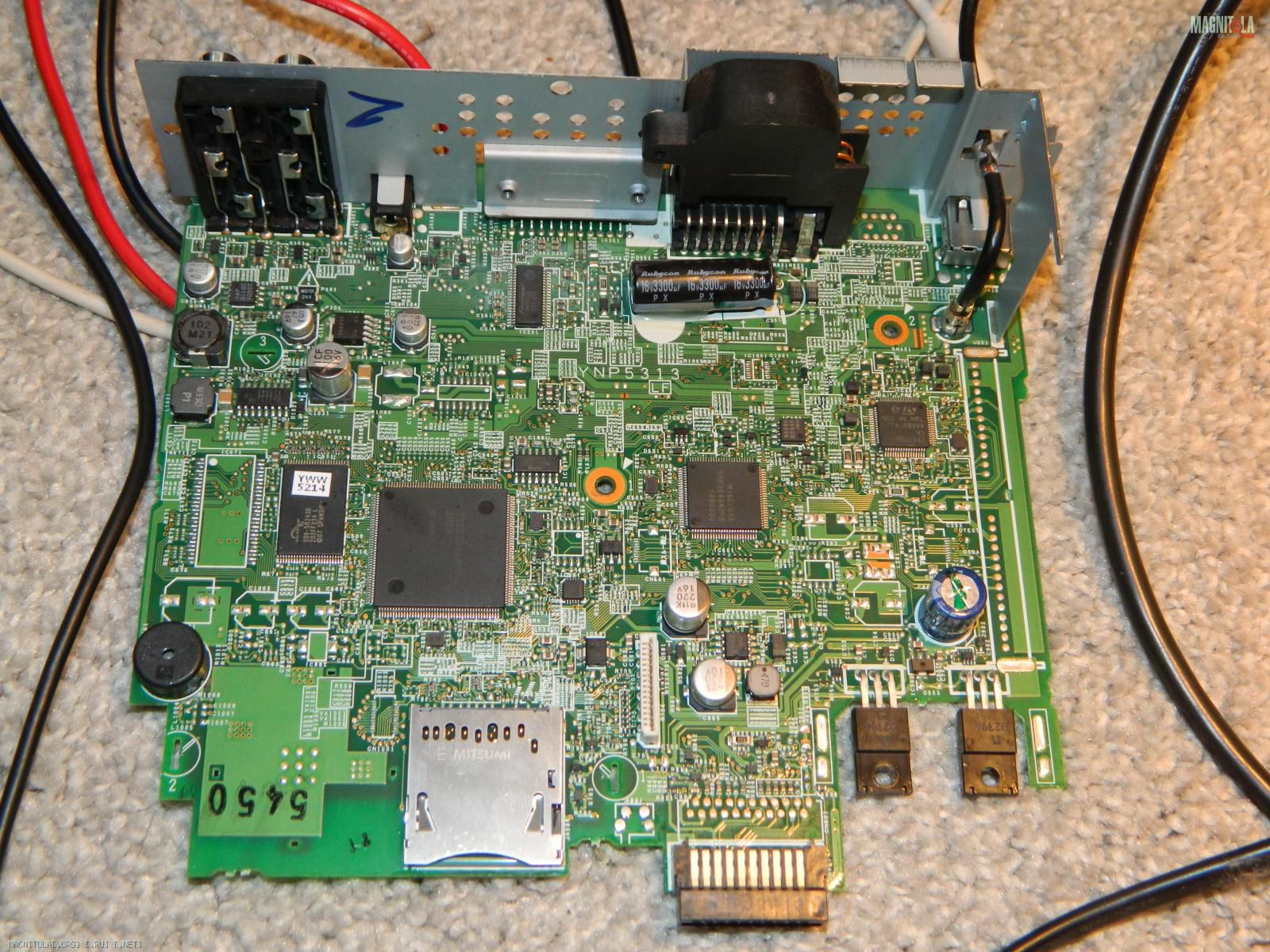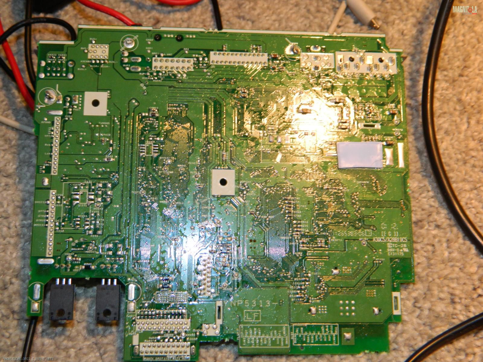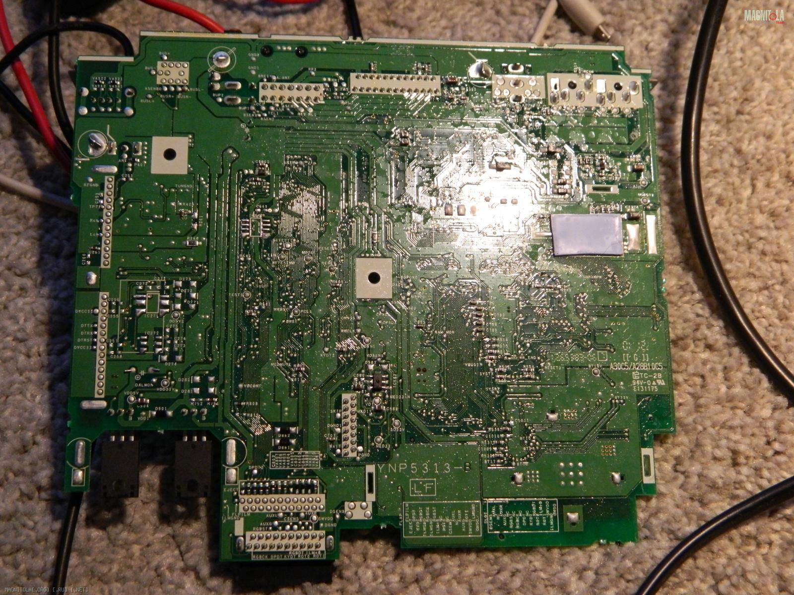 Проблема в транзисторных сборках может быть(см. первое фото,которое Вы привели http://magnitola.org/attachment/5/2/4/6/4/572986.thumb )Они сдвоенные и находятся сразу за РСА разъёмами, на печатной плате.Там их три штуки с шестью ножками(СМД).Прозвоните тестером и найдите неисправный.Эти транзисторы отвечают за блокировку MUTE.Других проблем быть не может.База транзисторной сборки находится посередине, с каждой стороны этой сборки.,