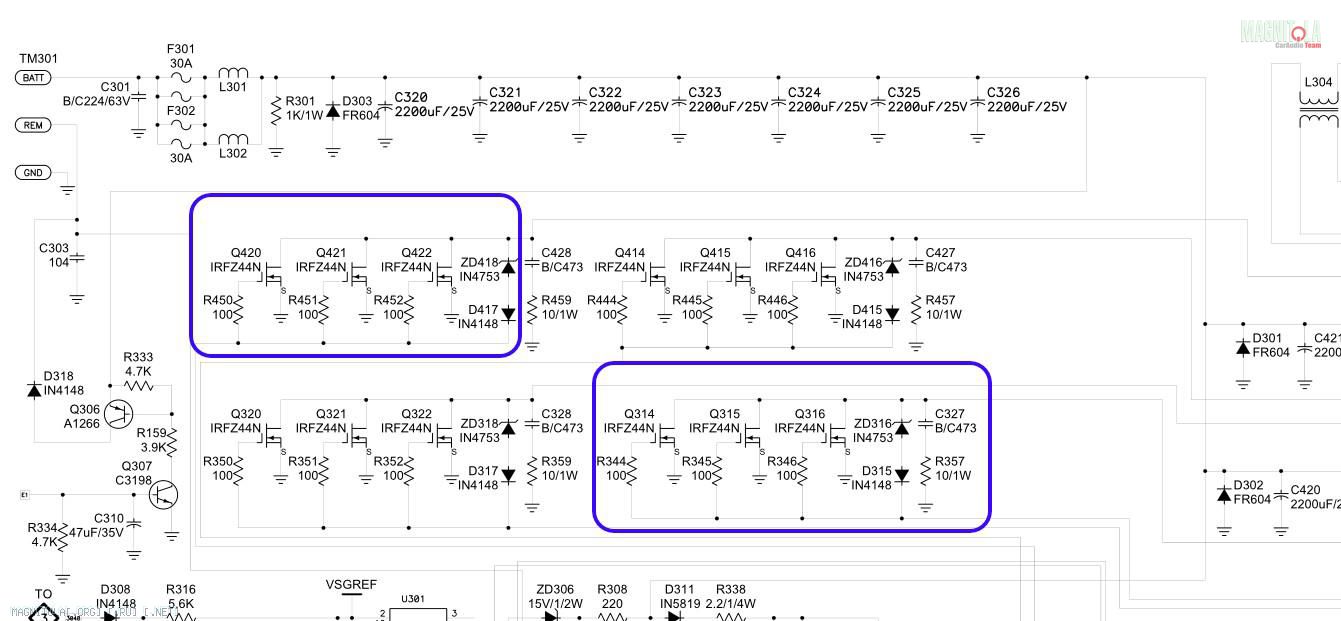 Смотрите пред каскад,после микросхемы к затворам,если транзистор в утечке-вероятность велика в этом трабле,лучше их заменить все,для уверенности.Это только маленькое начало исследований-чудес не бывает в этом.,