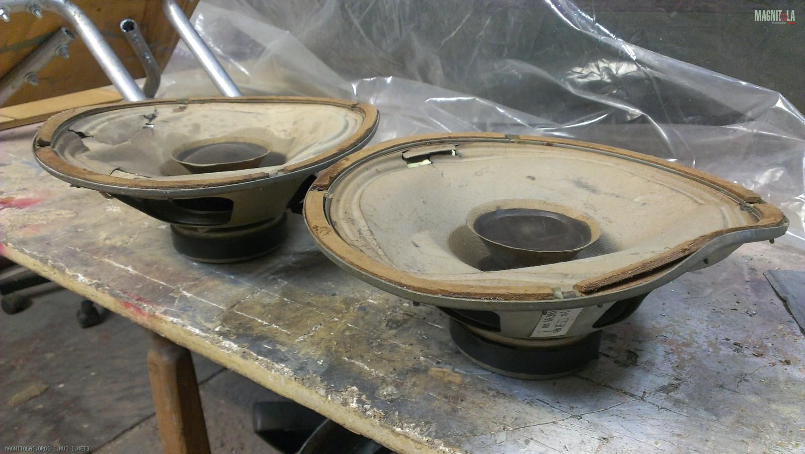Какими динамики мне достались, видно на фото. Вложение 715374Вложение 715376 Хозяин долго использовал их с треснутыми диффузорами, в итоге в некоторых местах нехватало кусков диффузора. От усилителя провода к динамикам приматывались прямо к подводящим гибким проводам. После этого динамики были аккуратно сняты на ремонт, упакованы и так же аккуратно перееханы машиной. В итоге: рама согнута (дины стали овалами), катушку заклинило, диффузор разорвало, подводящие оторваны. Когда начал править ошибся и раздавил один динамик в лепешку. Корзину выправлял, вставляя магнит вот в эту дырку в деревообрабатывающем станке Вложение 715382 , упираясь и вытягивая за корзину. Сторону, в которую нужно тянуть определял, оттягивая диффузор за центральный конус в разные стороны, пока катушка не начинала двигаться, делал пометку на диффузоре и вытягивал противоположную сторону. Подпаял проводники Вложение 715380 Трещины заклеял моментом, недостающие куски диффузора добрал лейкопластывем. Хотел покрасить диффузор маркером в черный, но хозяин сказал, что не нужно, я, конечно, по этому поводу недоумевал. Итог Вложение 715378