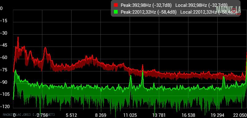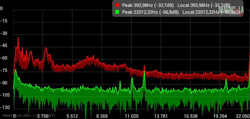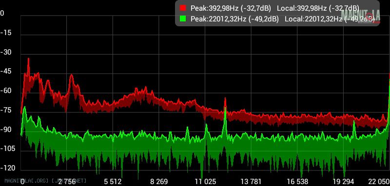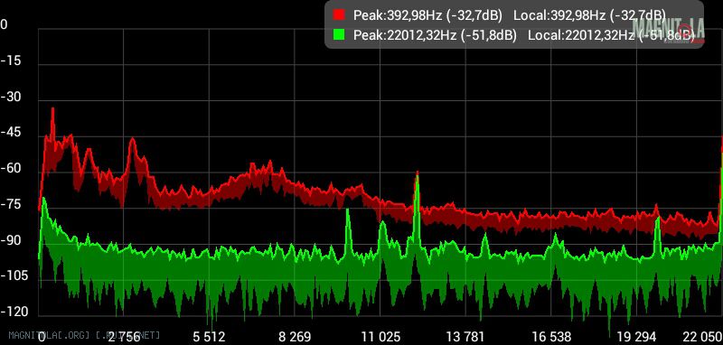 История такова: взят на пробу б/у усь DLS RA 25. После подключения питания от отдельной АКБ, и включения ремоута, подачей от питающего плюса, почти сразу появился тихий свист внутри уся (межблоки и акустические ещё не подключил). Убираешь ремоут - нет свиста, подклчаешь ремоут - свист есть. После 4-5 выключений свист пропал. Характер свиста не постоянный, плавающий, не громкий, слышен только почти в полной тишине (усь подключал в багажнике 2110, в гараже, контакта с кузовом нет, пол в одеяле). Думал, может это в мозгах звенит. Под рукой был смартфон с ачх-ометром Spectrum Analyze. Включил, поднес к прорезям на тыльной стороне уся. Что показало, видно на ниже приведённых скринах из проги.