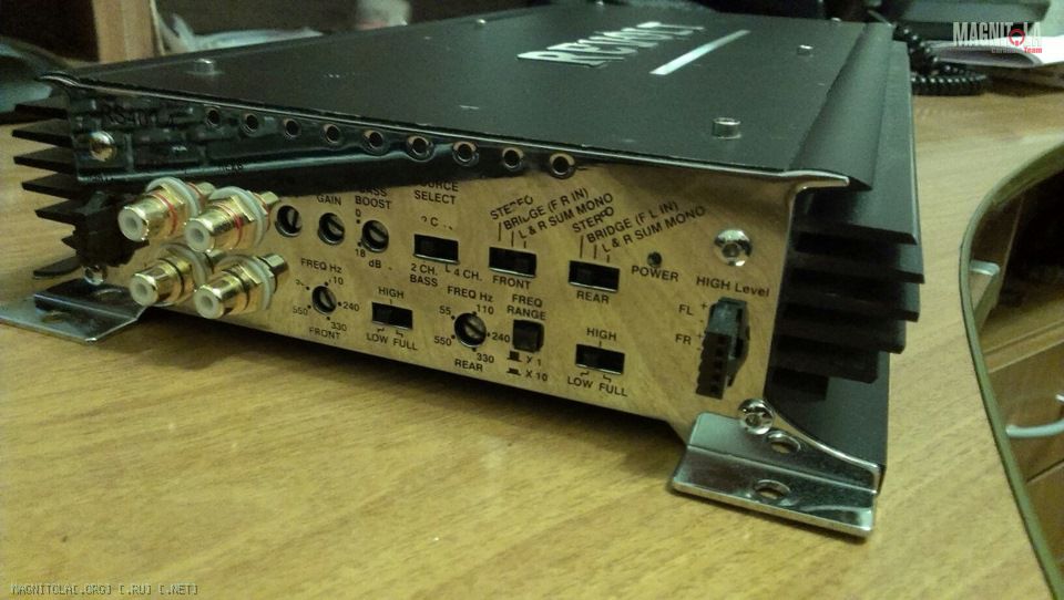 Конечно теперь уже не причем.Каждая пара каналов может работать в трёх режимах: обычный (стерео), мостовой с одним входом и мостовой с суммированием сигналов L и R. Кроме того, аппарат способен действовать в обычном режиме с двумя входами (Front). Есть ещё хитрый режим, который в обычных усилителях реализуется только с помощью пары разветвителей: вы подаёте сигнал только на Front, эти каналы будут работать, как положено, в режиме стерео, а Rear — мостом и от суммы сигналов L и R (ничего себе, да?). Басовый регулятор работает только в каналах Front, хотя сам регулятор установлен рядом с регулятором Rear Gain. Фильтры в каналах Front перестраиваются в диапазоне 50 — 550 Гц, а в каналах Rear есть кнопочка «х10», и полный диапазон составляет 50 — 5500 Гц.(журнал