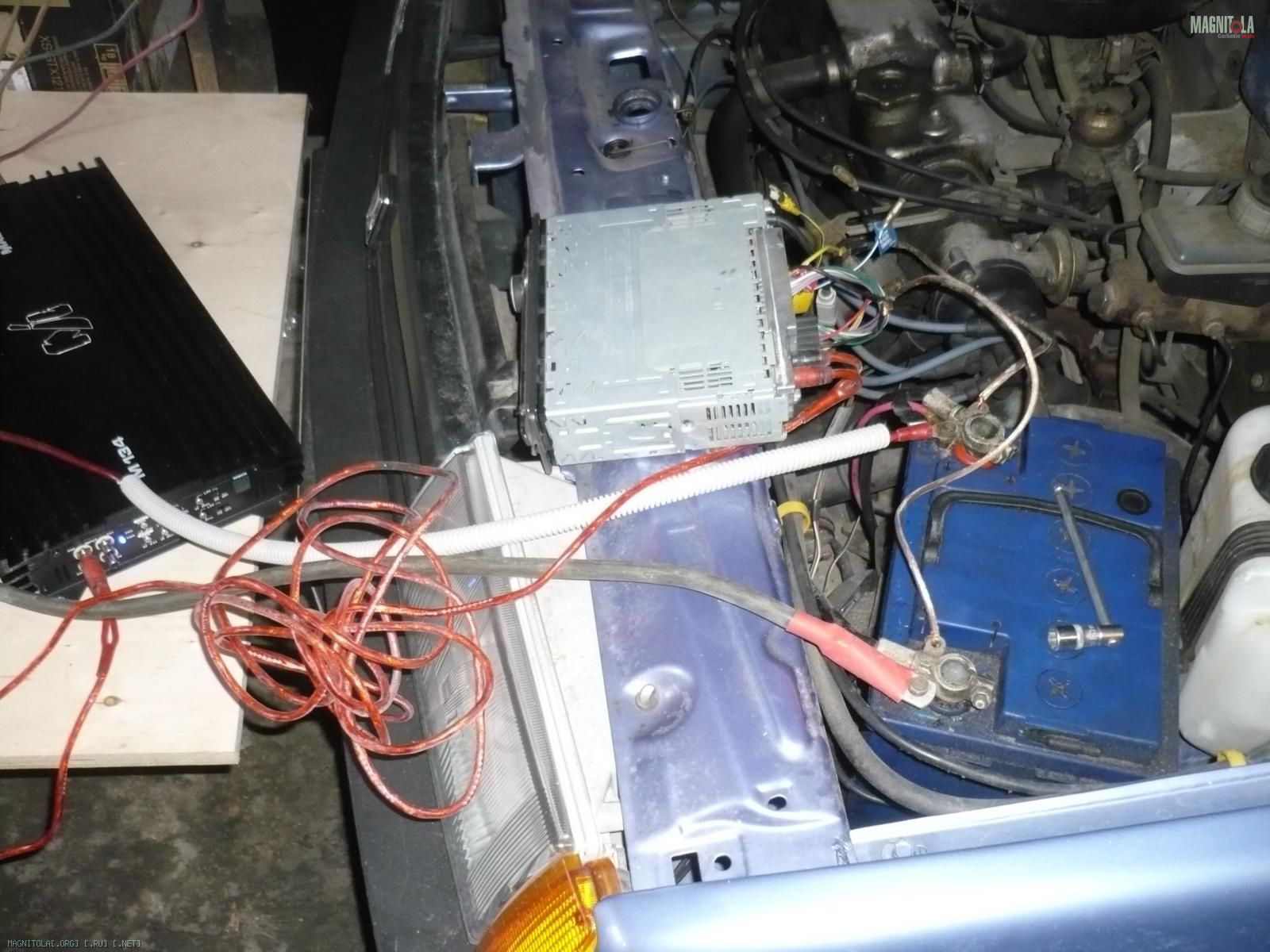 Усилитель установить на площадку,чтобы он не соприкасался с кузовом авто.ГУ запитывается на прямую от АКБ,плюс через предохранитель,возле АКБ(клемма +),на минус не нужно предохранителя,но он тоже протягивается от АКБ.