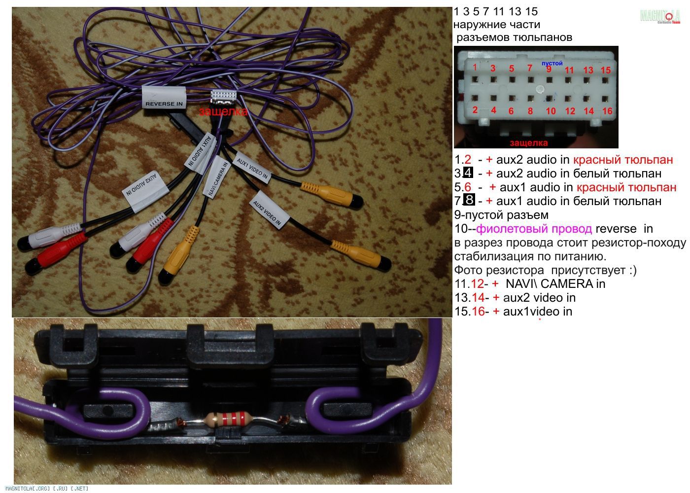 Фиолетово-белый провод подключен, и подключен по рекомендациям производителя ГУ: на плюс ламп освещения заднего хода. Это правильно, или нет? Подключал не сам, но проверил подключение сам. Защитный резистор на месте. ГУ явно видит сигнал, и при включении заднего хода переключается на камеру, транслируя на дисплее изображение с камеры.
