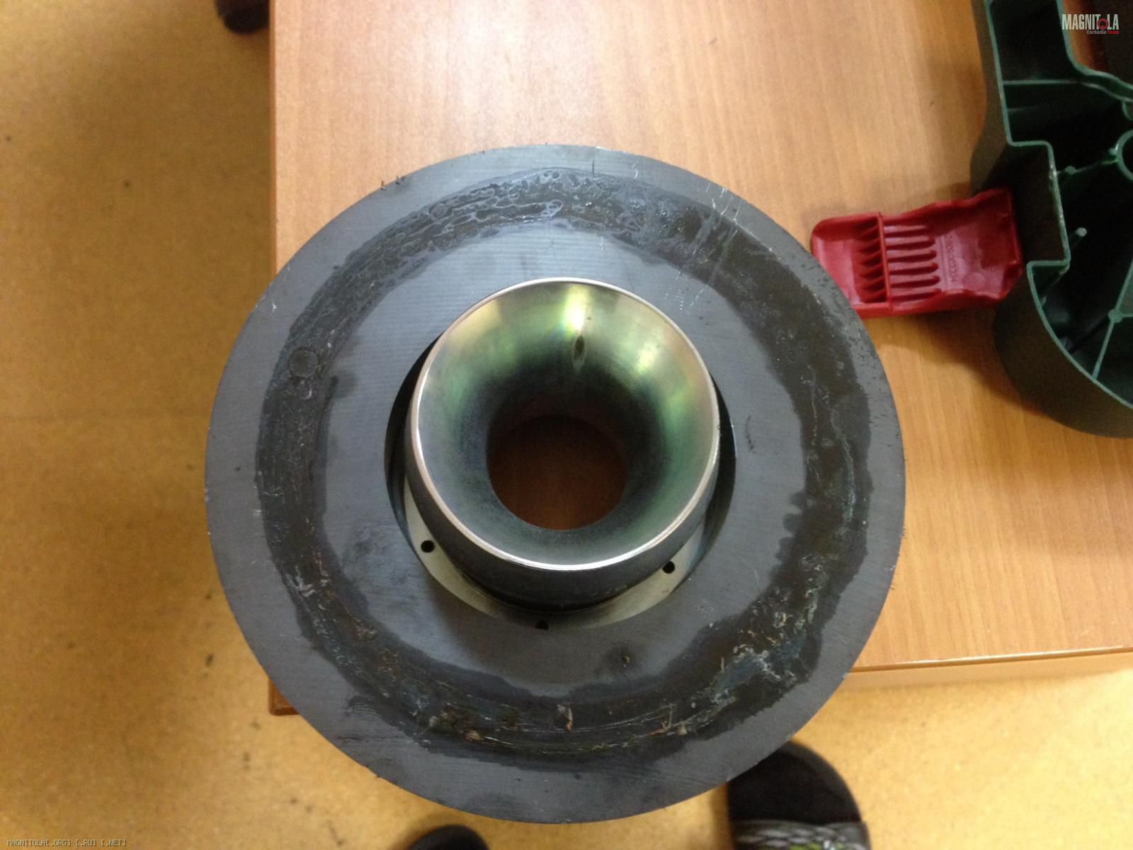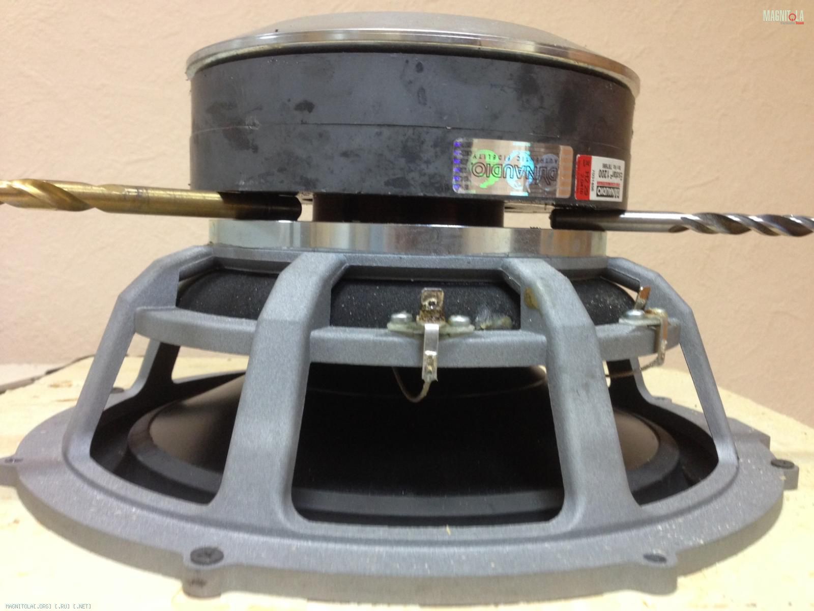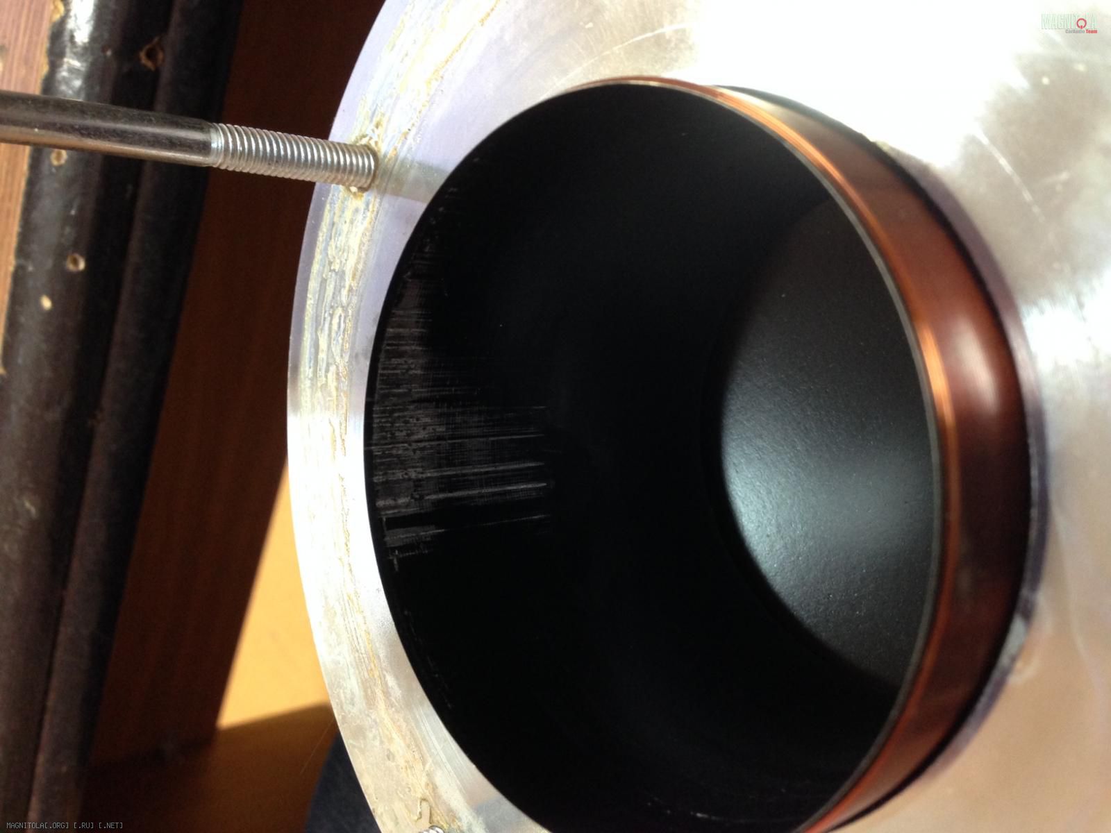 Всем привет. Являюсь счастливым владельцем сабвуфега Dynaudio Esotar 1200. Во время колхоза коробочки-стелс в крыло, постигло меня несчастье, а именно - магнитная система саба отлепилась и сдвинулась на один из боков, намертво заклинив диффузор, по типу «ни туды и ни сюды». Заметил я это непотребство до подключения к усилителю, поэтому тешил себя надеждой, что обмотка, как минимум не сгорела под напругой. Попрыгав вокруг тушки динамика, отзвонился гуру «Dynaudio» Александру Мартьянову, который посоветовал у токаря выточить приблуду в виде кольца, и не разбирая саба отцентровать магнит, после чего залить эпоксидкой по окружности. Походил, вокруг да около, решил сдернуть защитную решетку на магнитной системе. Через дырку отверстие увидел что катушка образовала «залом».