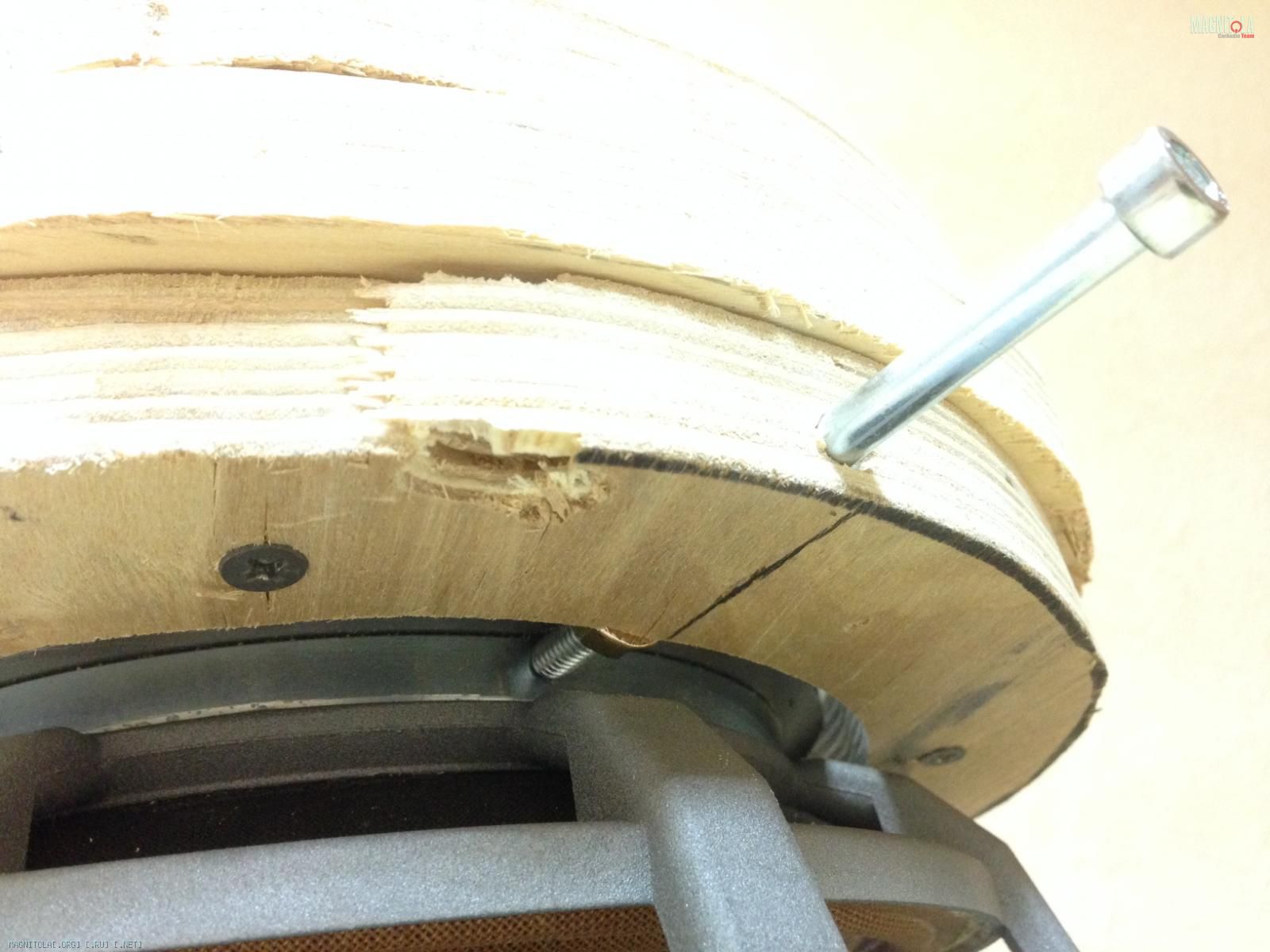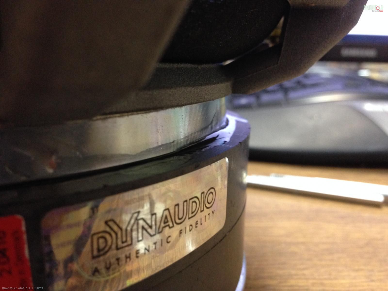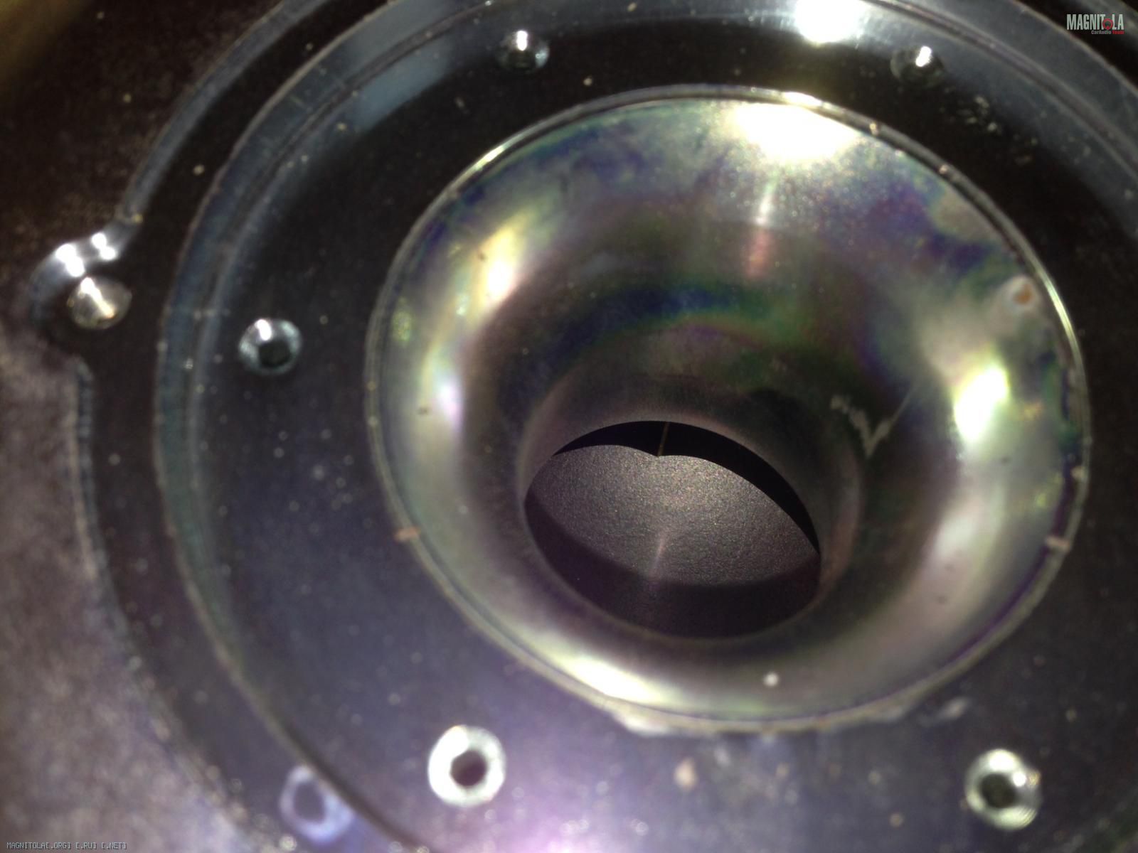 Всем привет. Являюсь счастливым владельцем сабвуфега Dynaudio Esotar 1200. Во время колхоза коробочки-стелс в крыло, постигло меня несчастье, а именно - магнитная система саба отлепилась и сдвинулась на один из боков, намертво заклинив диффузор, по типу «ни туды и ни сюды». Заметил я это непотребство до подключения к усилителю, поэтому тешил себя надеждой, что обмотка, как минимум не сгорела под напругой. Попрыгав вокруг тушки динамика, отзвонился гуру «Dynaudio» Александру Мартьянову, который посоветовал у токаря выточить приблуду в виде кольца, и не разбирая саба отцентровать магнит, после чего залить эпоксидкой по окружности. Походил, вокруг да около, решил сдернуть защитную решетку на магнитной системе. Через дырку отверстие увидел что катушка образовала «залом».