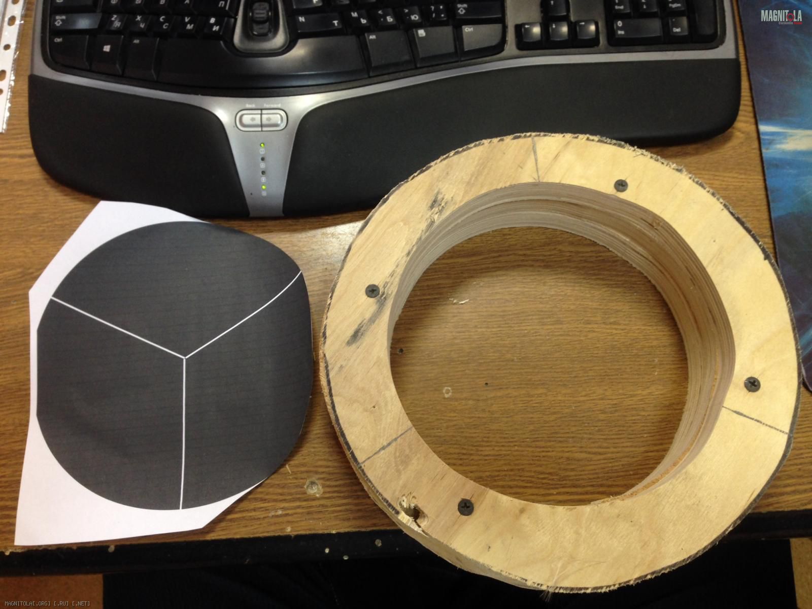Расстроился еще больше. Со словами «хуже все равно некуда», игнорируя советы «куда ты лезешь», решил разбирать. Помня совет по поводу приблуды в виде кольца, решил маленько ее даунгрейдить (руки чесались аж жуть, а бегать за токарем неделю и потом еще и отдавать охулиард копеек не хотелось). Короч, вырезал из фанеры 16 мм три кольца с внутренним диаметром + 2сантиметра от максимального диаметра магнитной системы. Стянул кольца саморезами. В Фотошопе нарисовал разметочное лекало для болтов с углами в 120 градусов, разметил и просверлил три дырки отверстия. Чуток выше просверлил еще три таких же. Получилась пародия на аппарат Илизарова для саба :)
