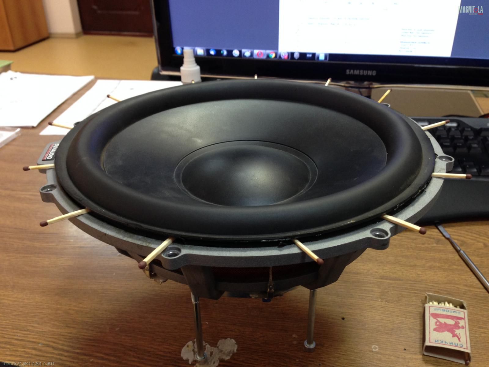 С утра вынимаю полосы бумаги, которые я использовал для центровки и любуюсь результатом. Беру клей Момент Универсальный «Момент 88» (тот же самый БФ-88) промазываю место вклейки диффузора и сам диффузор, и спустя 10 минут сажу диффузор на место. Надо отдать должное датчанам – посадочное место и сам диффузор подогнаны под размер идеально. Даю пару часов схватиться клею в котельной с температурой воздуха 50 градусов. После чего припаиваю подводящие и подключаю саб к ресиверу. По совету из этой темы скачиваю программу Wavosaur.1.0.7.0. в которой создаю звуковой файл с синусом на 5 Гц. Включаю файл на воспроизведение и снова радуюсь – диффузор отцентровался сам. Для очистки совести подвигал центрующую юбку вправо-влево – появлялся звук трения. Залил клеем юбку и оставил на ночь. От так от приобрел опыт разборки сабов. Может кому поможет в подобной ситации.