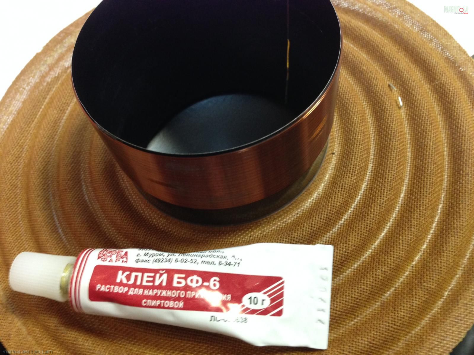 Снимаю конструкцию «Илизарова» и потихоньку расширяю щель между магнитом и корзиной, пока не снял. Смотрю на магнит и плююсь в сторону производителя. Саб за 92 тысячи (ну это седня он так стоит) а клея явно за###или. Кстати залом катушки оказался не повреждением, а местом, через которое производитель пропустил подводящие провода. Обнаружил терку от клина на внутренней стороне катушки.