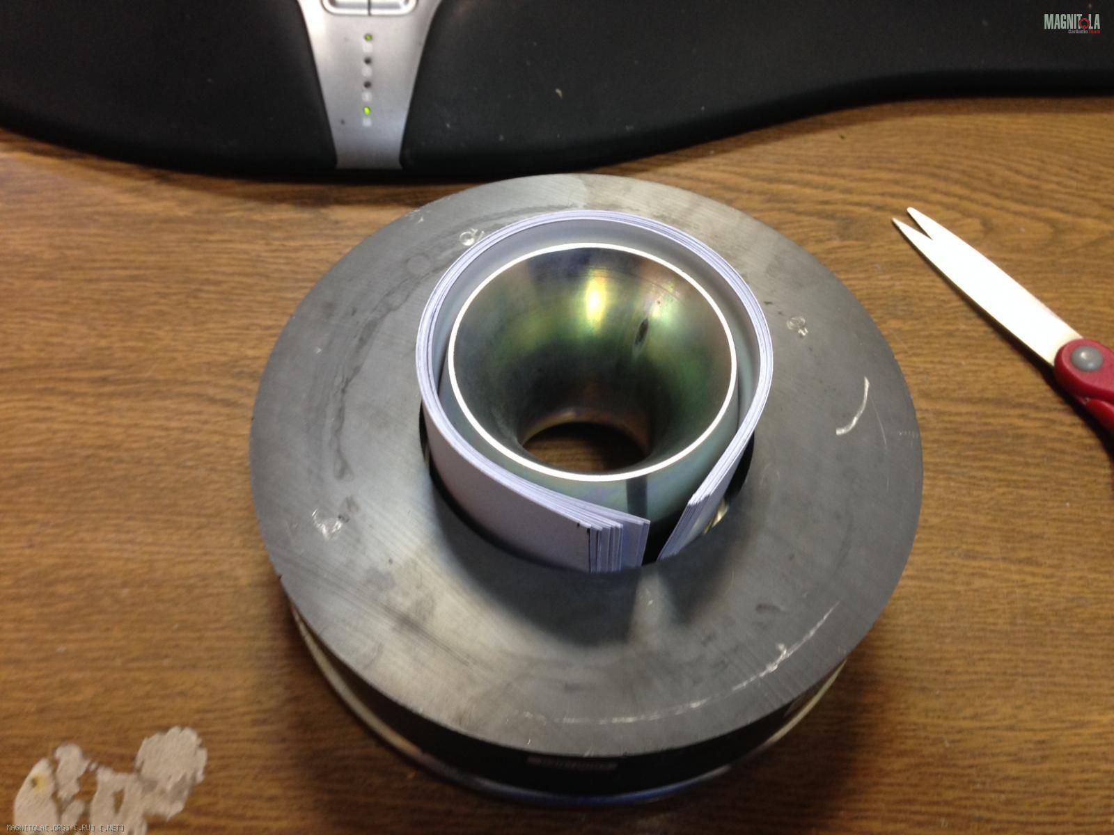 Зачищаю корзину и магнитную систему от остатков клея и вырезаю из плотной бумаги (280 г/м) полоски 7х23,5 см. Эти полоски вкладываю в отклеившуюся часть магнитной системы для последующей ее центровки.