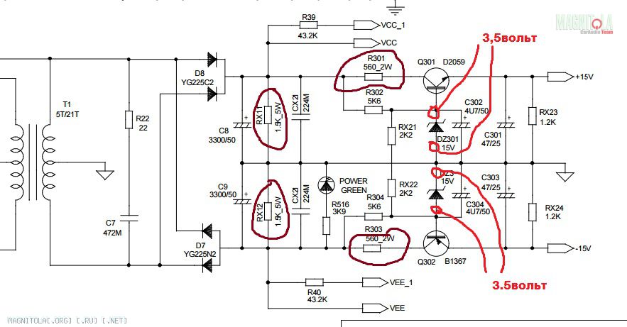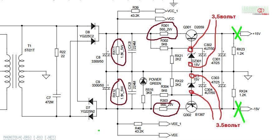 Для начала проверьте стабилитроны, выпаяв Q301, Q302 на них должно быть по 15 Вольт.