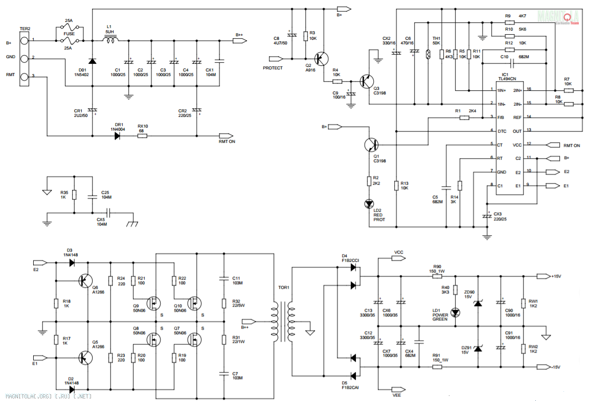 На днях появится. еще бы понять откуда то двигаться с осциллографом?( т.е. какие элементы вводят в режим защиты усь.. с ШИМ то че могло случится если усилок включили без стабилизаторов 15в?