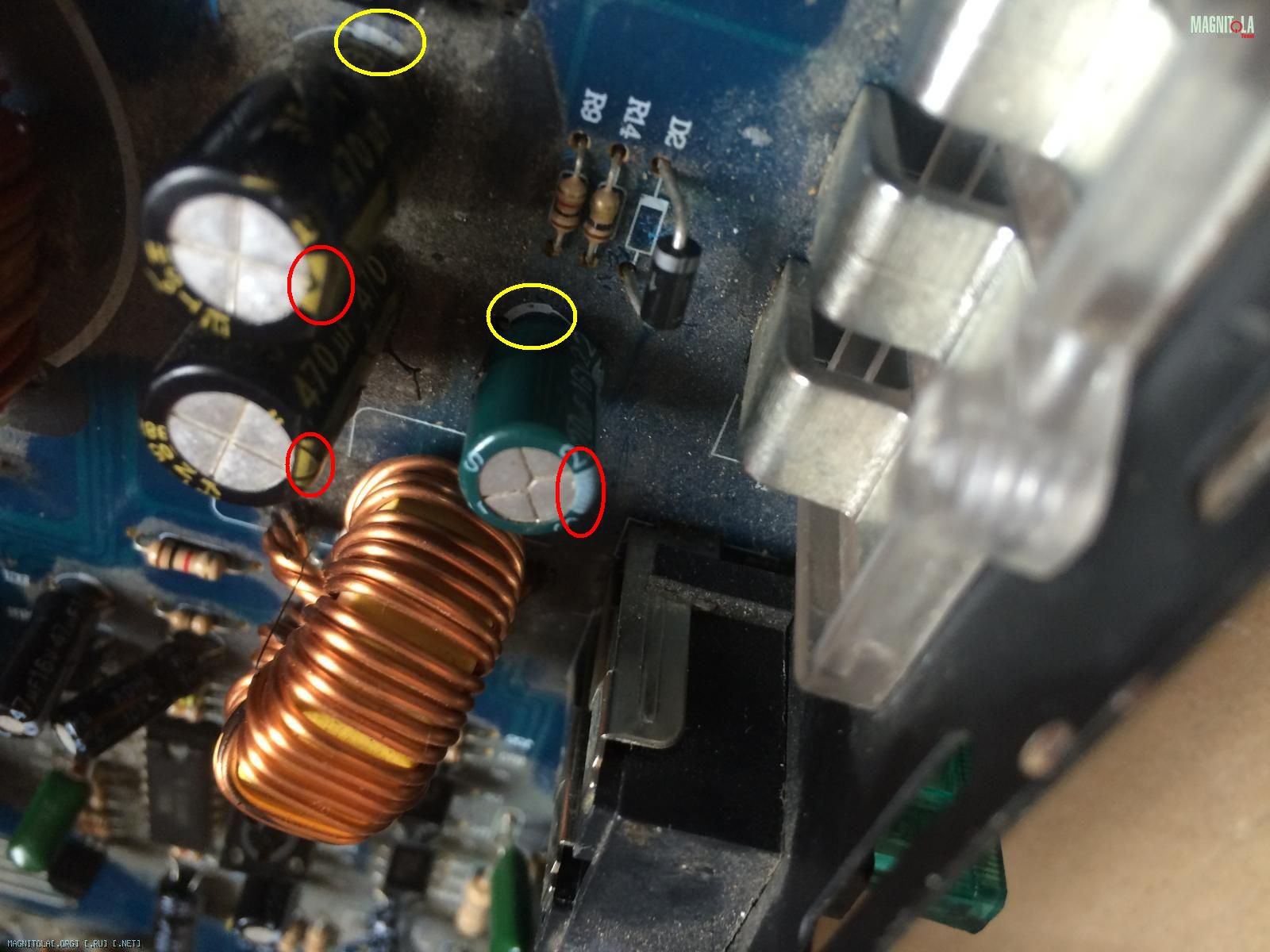 Электролитический конденсатор- деталь полярная, у него есть "+" и "-". Минус обозначен полосой на корпусе (красные кружочки на фото), на плате тоже есть обозначение- более толстая белая линия на окружности (отмечено желтым). Видно, что на синем конденсаторе эти метки не совпадают. Выпаять конденсатор, развернуть на 180 градусов и впаять.