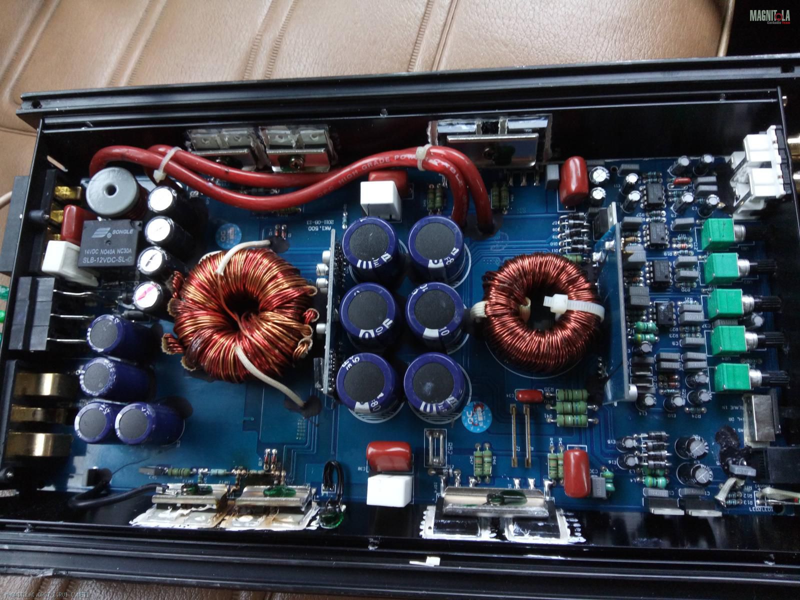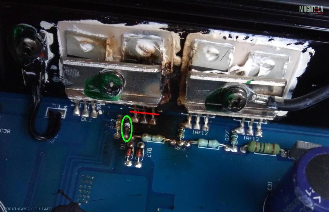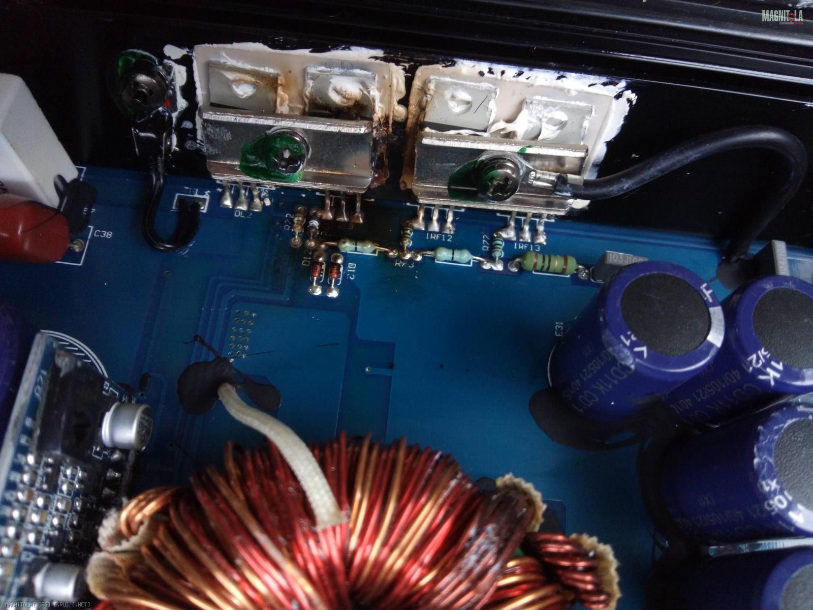 Сгорел один из трех транзисторов в плече преобразователя. Пробило по затвору, поэтому усилитель продолжает работать, хоть и с перекосом. Для начала перекусите ему ноги и отмойте плату спиртом от копоти. Для симметрии отрезать ноги у аналогичного транзистора с противоположной стороны. Мощность блока питания составит две трети от номинальной и так можно будет ездить, сильно не нагружая усилитель. Для полного ремонта нужно менять все шесть транзисторов и шесть сопротивлений. Вложение 1153044