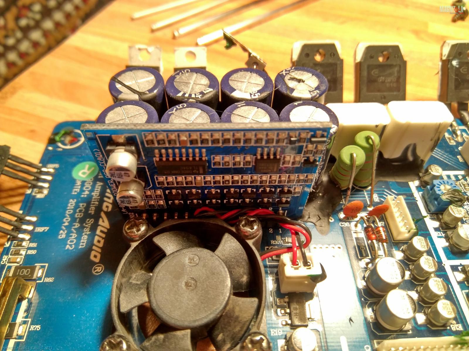 И тут проявился неконтакт: пропадает звук, затухание похоже на работу от конденсаторов (т.е. плавное затухание). Перестают работать оба моста. (Вентилятор охлаждения крутится, индикатор включения - горит