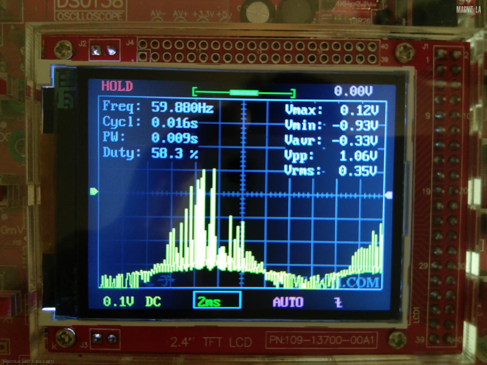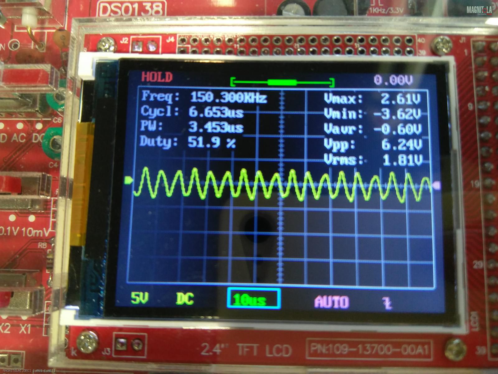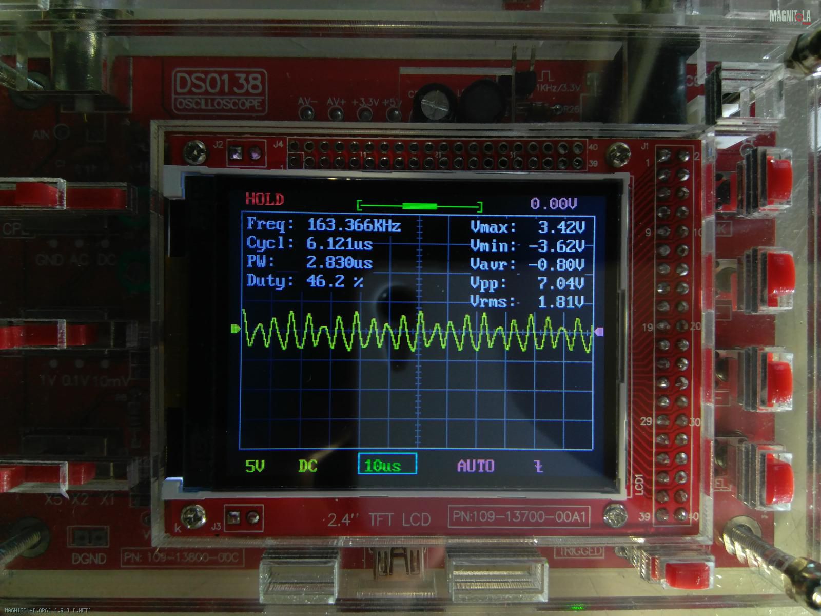 DSO 138...его игрушкой для введения в мир электроники назвали,60 кгц он уже криво показывает. Показал ,что есть сигнал хоть какой то и на том спасибо...