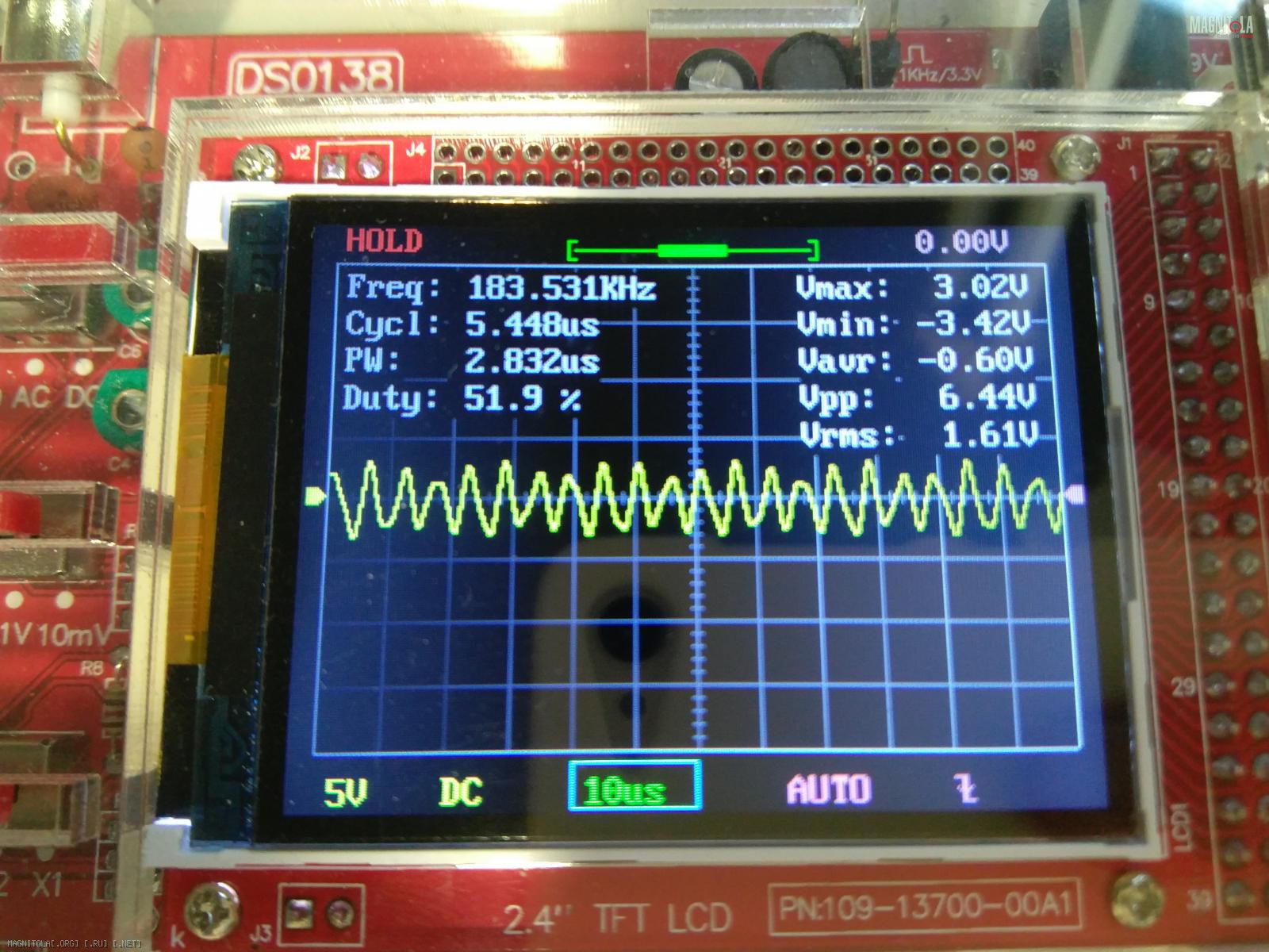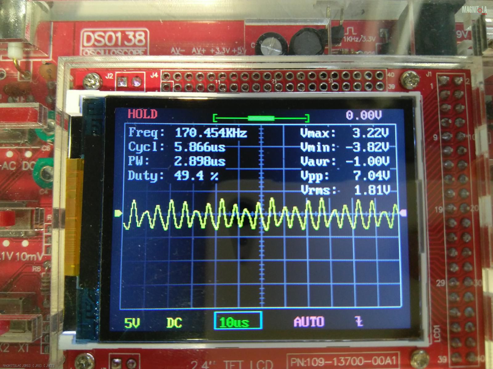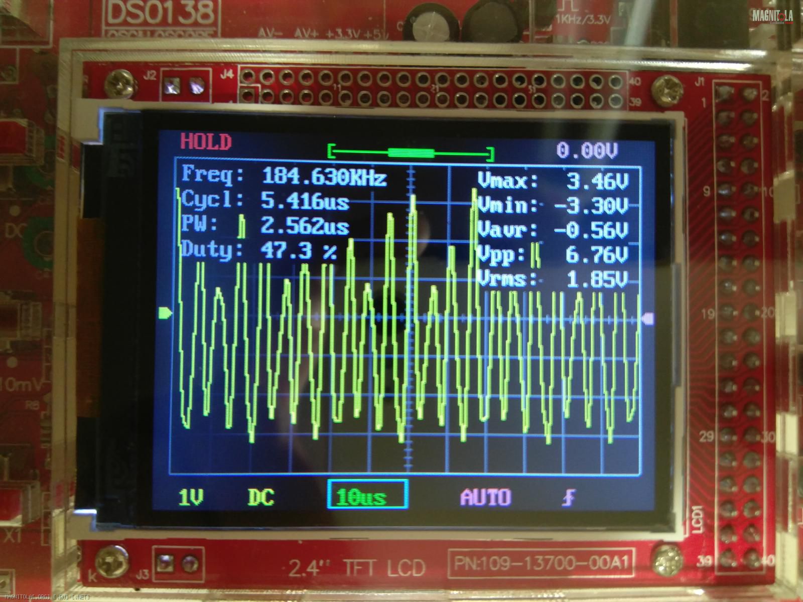 DSO 138...его игрушкой для введения в мир электроники назвали,60 кгц он уже криво показывает. Показал ,что есть сигнал хоть какой то и на том спасибо...
