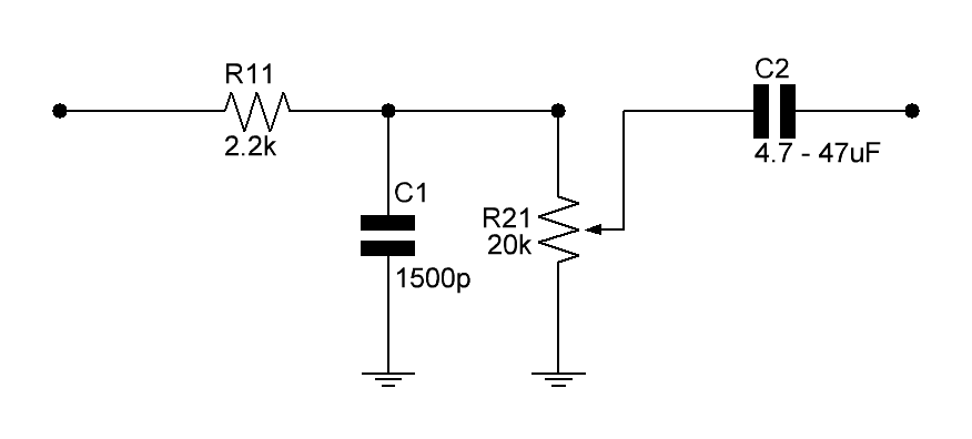 Получается с проца сигнал идет на переменик 20к последователь, после него нужно резистор цеплять на землю? Конденсатор нужно типа nichicon fg и какой емкости его взять?