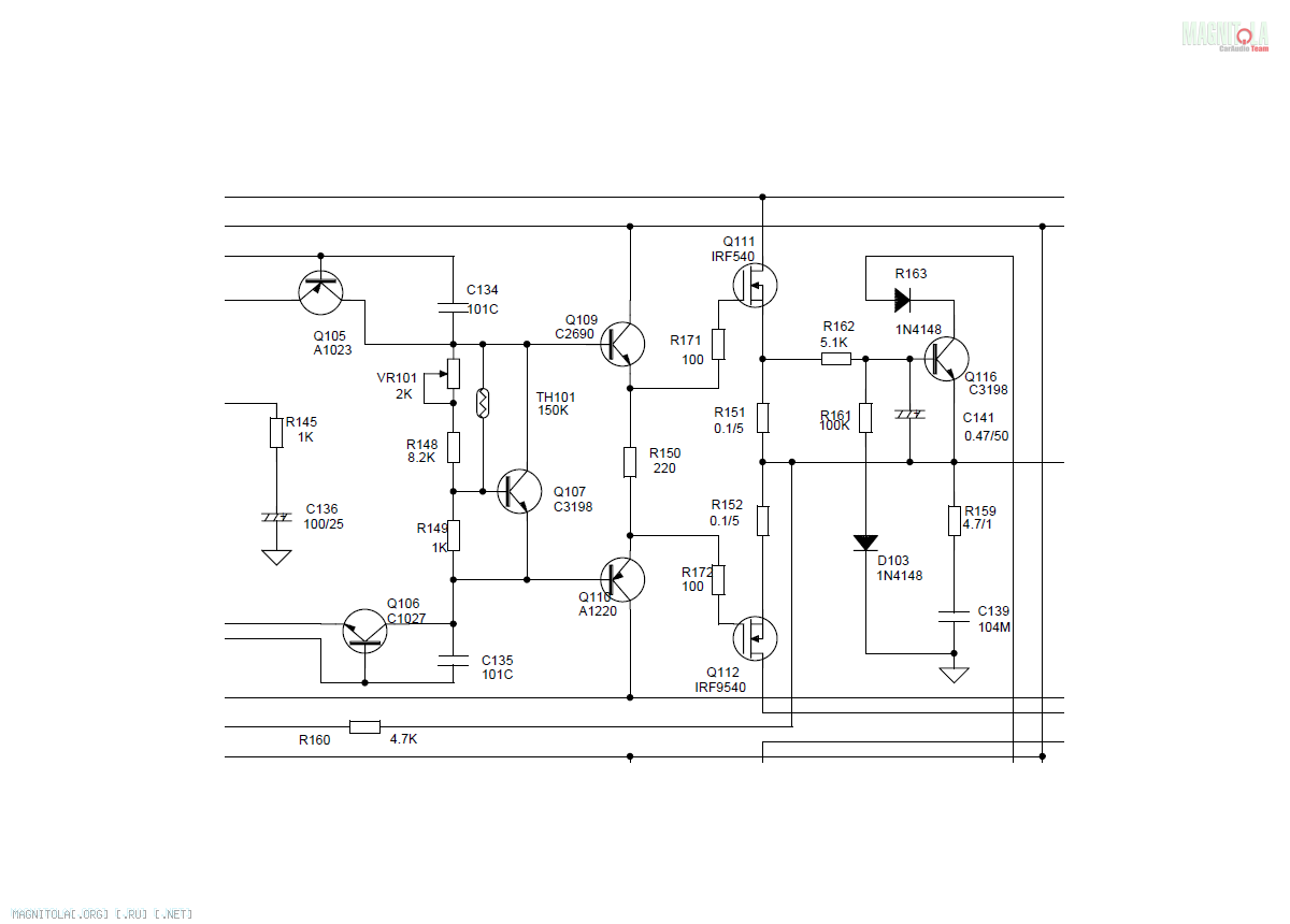 Решил еще раз проверить транзисторы предусилителя и оконечника, отключил усилитель от блока питания и на оконечных транзисторах каналов А и В осталось напряжение порядка 18в. Стал смотреть по схеме откуда оно идет и оказалось, что оно осталось в фильтруюших кондерах 4700 мкф преобразователя. При подключении к БП напряжение на стабилитроне dz1 16в, на dz2 13в и напряжение на переходах бк-бэ транзистора q30 примерно 5в.