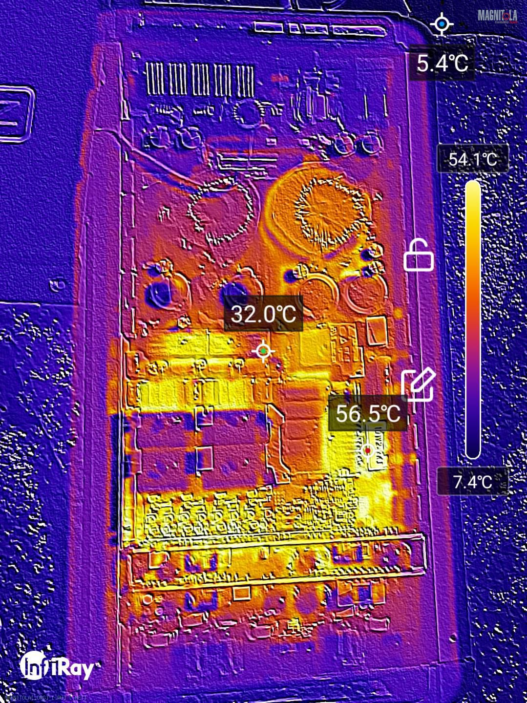 Вскрытие и замер камерой с тепловизором показал, что на плате греется сопротивление до 56 градусов.