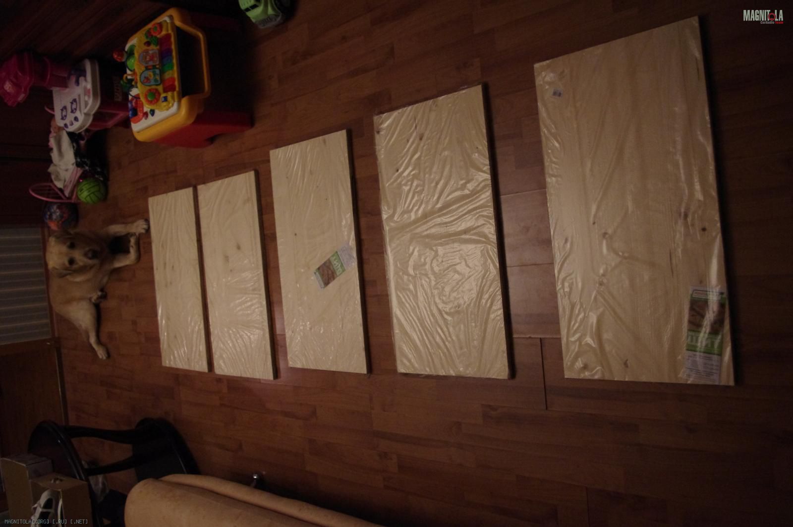 Берем доски (а также клей момент монтаж, шканты(чопики), шкурки, полуматовы паркетный лак, струбцины, малярный скотч) и пилим сабвуфер везём всё это домой.