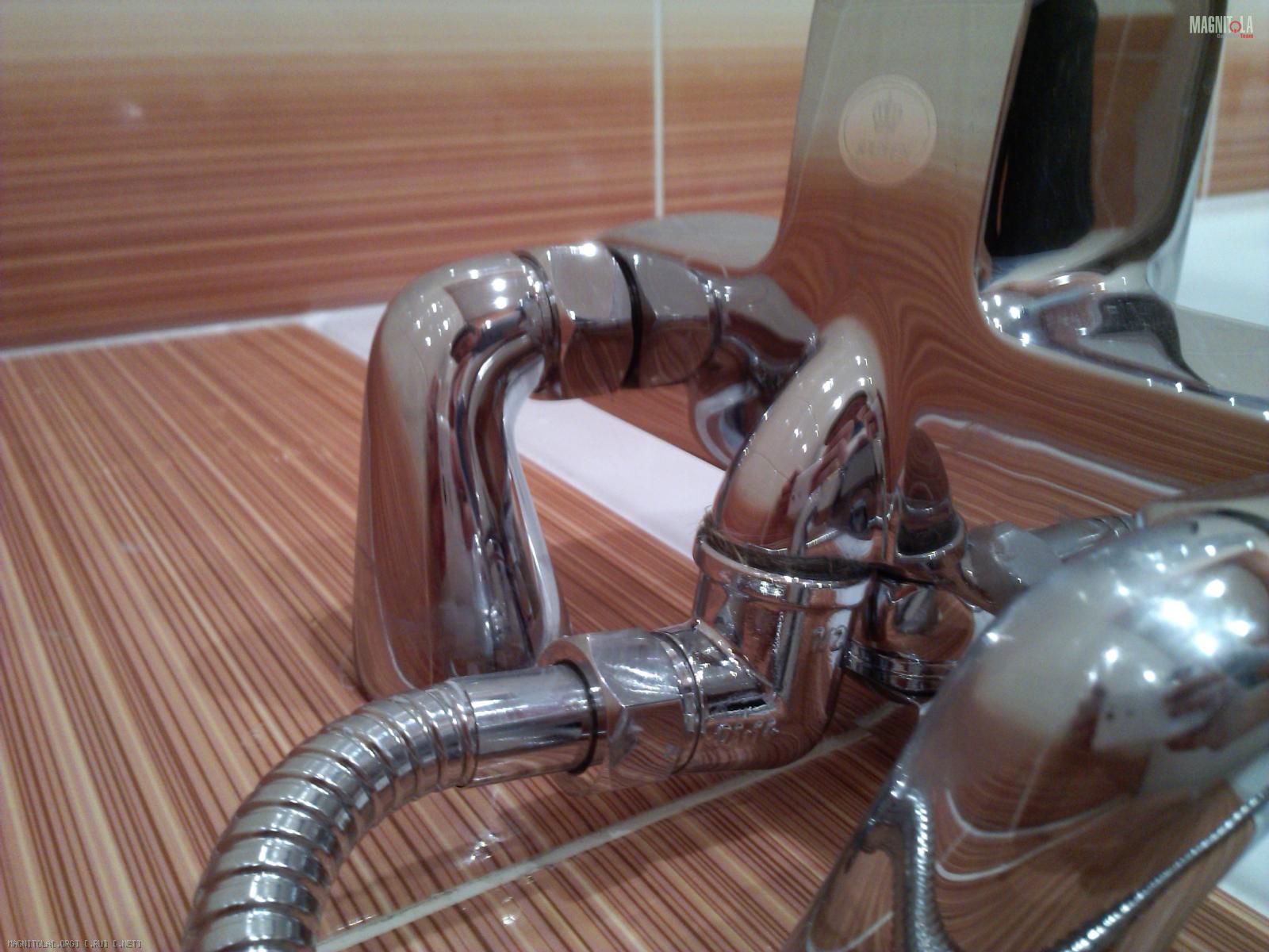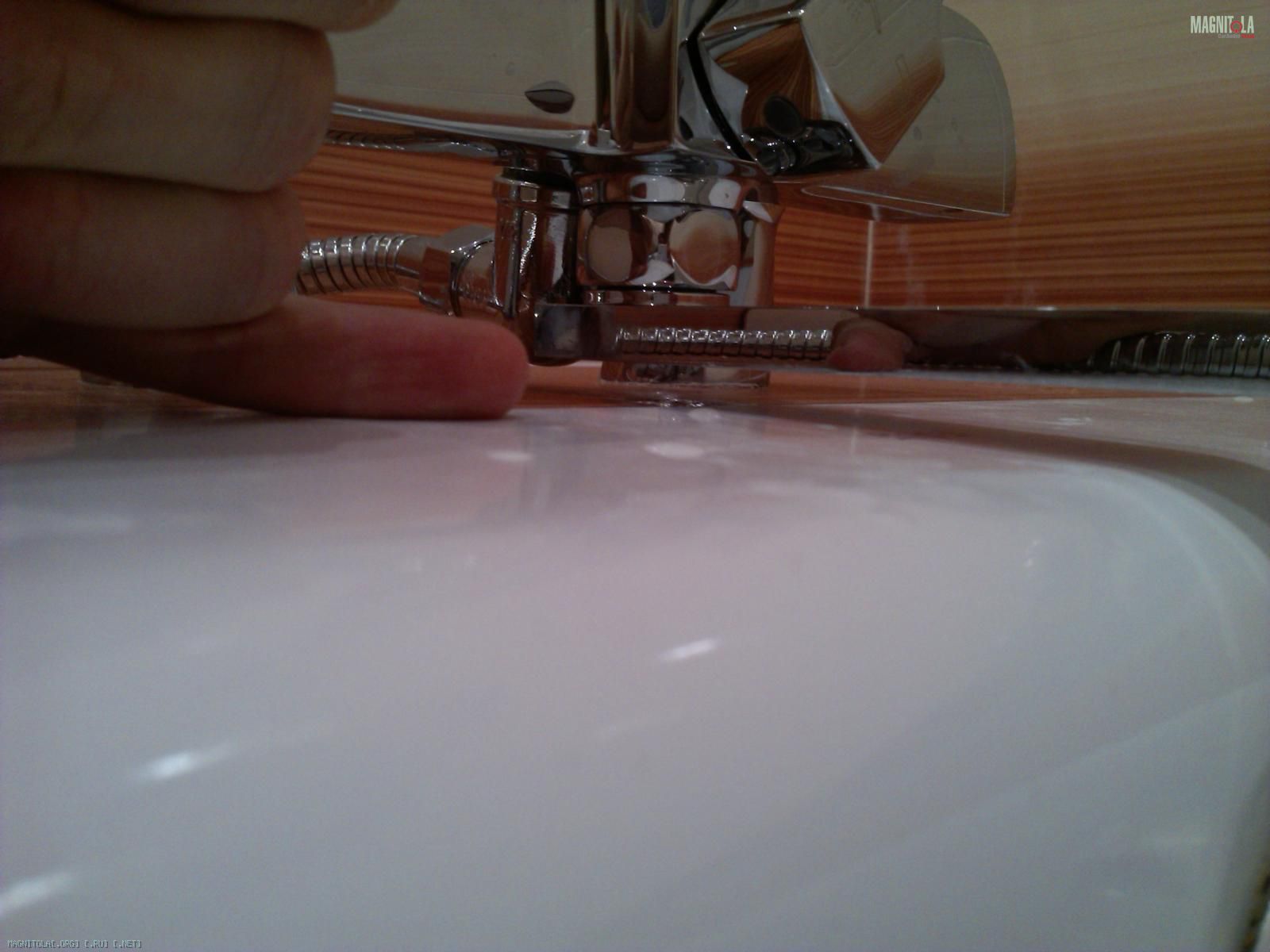 А вот этот самый кран! Расстояние до "пола" пол мизинца, был бы круглый - не влез! И тот самый хромированный уголок. С гайкой не нашел, поэтому посадил на лён с юнипаком, вроде не течет :D