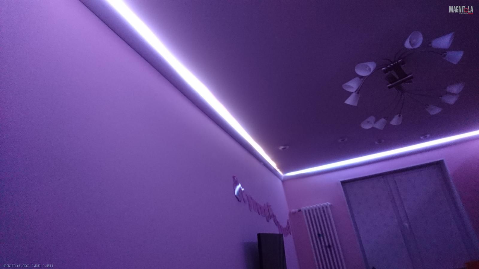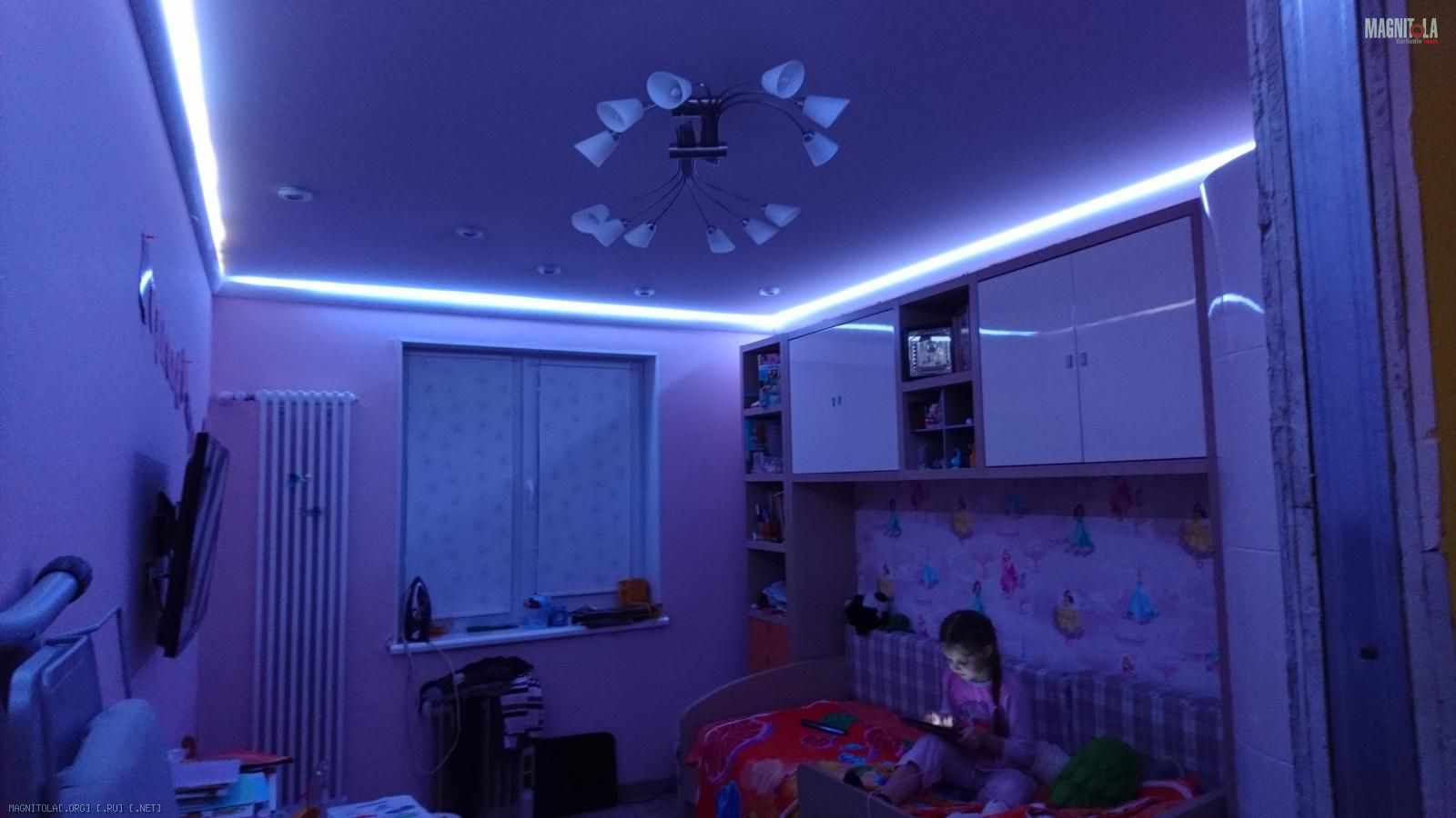 Доделал я наконец-то светодиодную подсветку в детской. Прошел год, как оборудование купил))) После долгих раздумий, как крепить ленту, все-таки был приобретен специальный потолочный плинтус по негуманной цене (15 метров вышли почти 10тыщ.) лента крепилась на двусторонний скотч к алюминиевому уголку 10мм, который уже вставлялся в плинтус. Косяк вылез один: просадка (на фото левый дальний угол) по причине того, что кусок ленты, 4,5м сборный на разъемах. Д Нужно докупить и поменять на целый. ля коммутации использовал ПВС 4Х1,5. Что хочу сказать после проделанной работы, знал бы что это так геморно да и не совсем дешевое удовольствие, не занялся бы)) Но мелкой нравиться