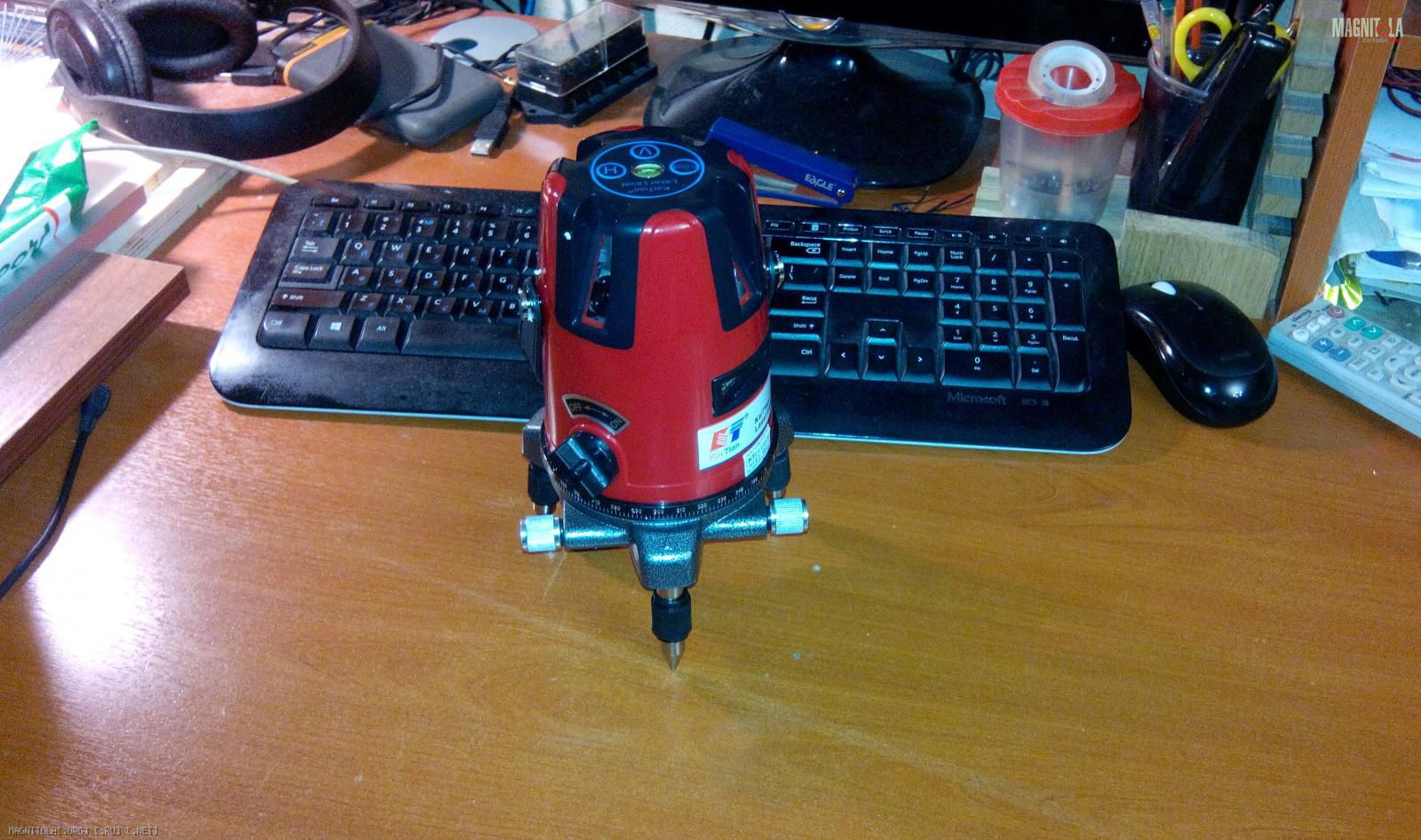 В пределах квартиры в хрущевке, где большая комната чуть больше 5 метров в длину, концы горизонтальной линии сходятся идеально. При условии, что придётся немного повозиться и выставить по пузырьковому глазу сверху точно по центру. Ещё можно ориентироваться на противный писк. Который выключится когда выровняешь. Т.е. в нём нет самовыравнивания. Но за 2600 р у нас можно купить только линейку ))) Так он ещё и вертикальную плоскость строит почти на 360 градусов. От точки под ним до линии около 35 см. Для профиля гипсокартонного это не помеха.
